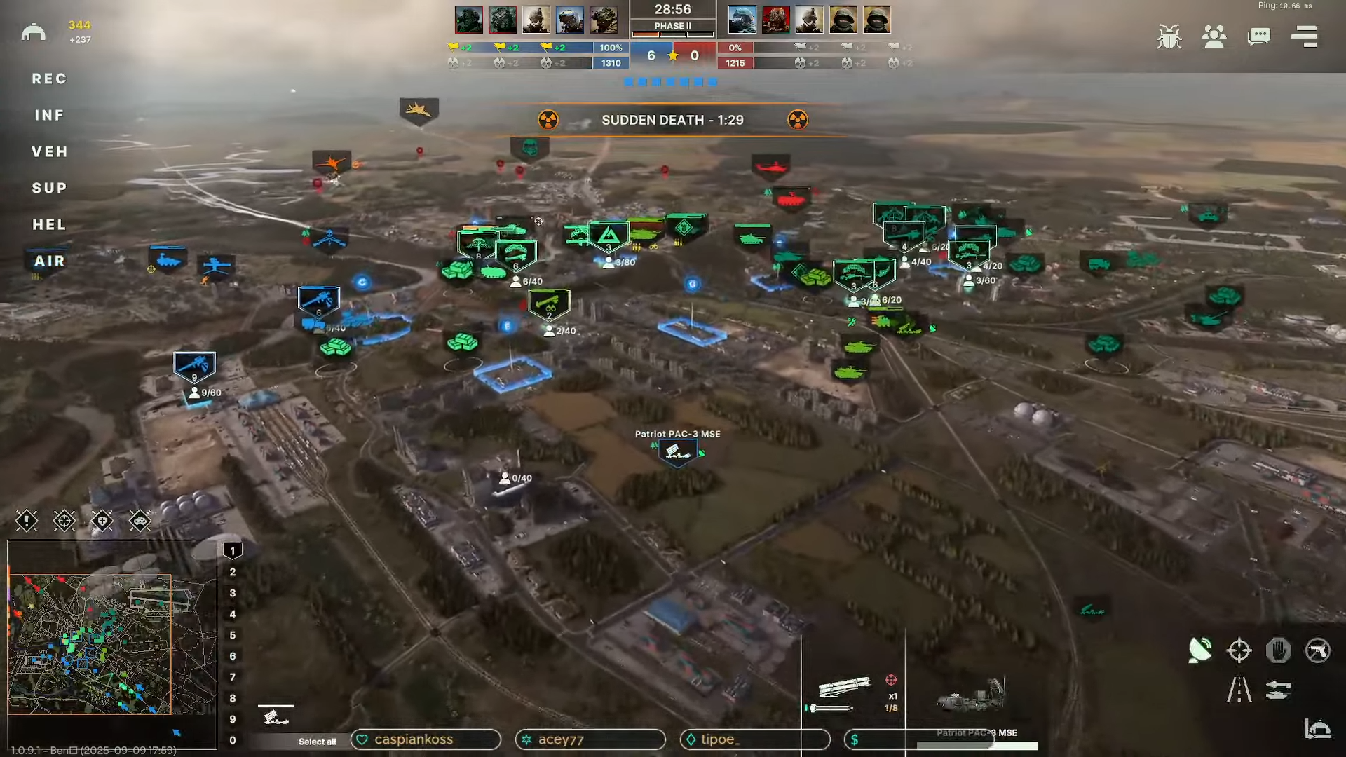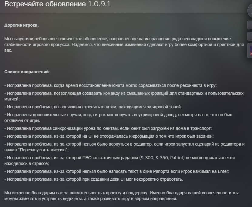 • Исправлена проблема, когда время восстановление юнита могло сбрасываться после реконнекта в игру; • Исправлена проблема, позволяющая создавать команду из смешанных фракций для стандартных и пользовательских матчей; • Исправлена проблема, позволяющая стрелять юнитам, находящимися за игровой зоной. • Исправлены дополнительные случаи, когда игрок мог получать внутриигровой доход, несмотря на то, что он был отключен от игры. • Исправлена проблема синхронизации урона по юнитам, если юнит был загружен из дома в транспорт; • Исправлена проблема, из-за которой на UI не отображалась информация о том что игрок был забанен; • Исправлена проблема, из-за которой нельзя было вернуться в редактор, если игрок запустил сценарий из редактора и нажал "Перезапустить миссию"; • Исправлена проблема, из-за которой ПВО со статичным радаром (S-300, S-350, Patriot) не могло двигаться если находилось в стрессе; • Исправлена проблема, из-за которой нельзя было написать текст в окне Репорта если игрок нажимал на Enter; • Исправлена проблема, из-за которой при создании деки UI мог некорректно отработать.