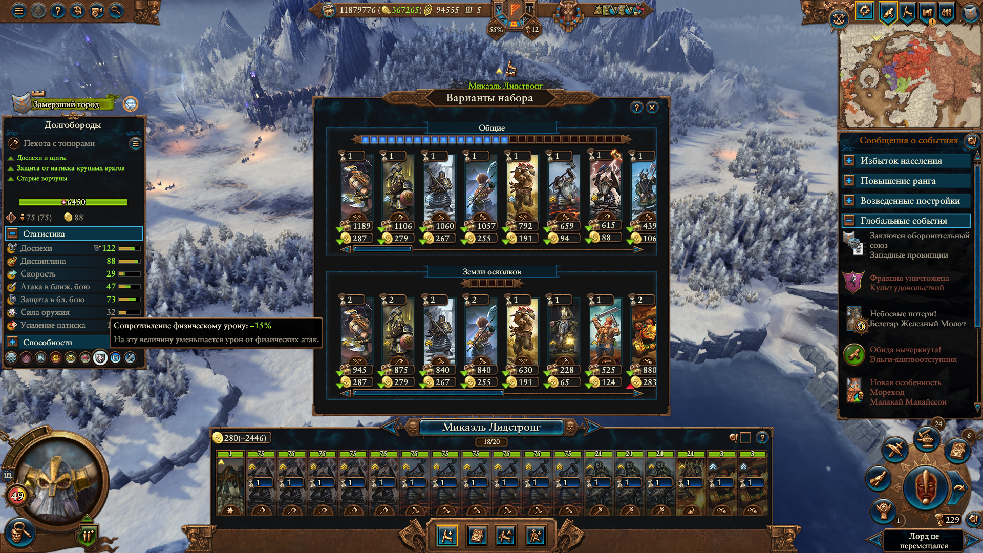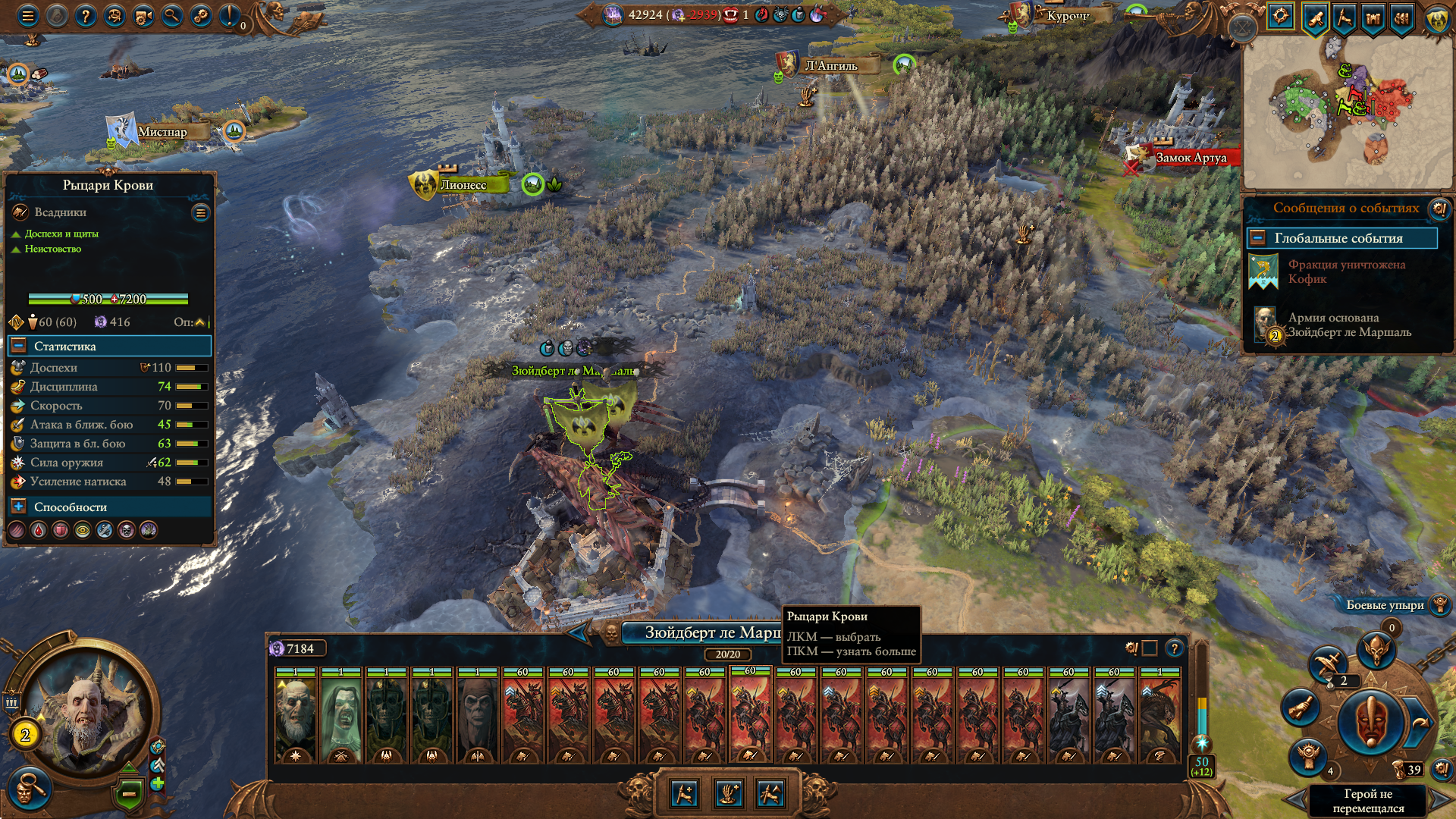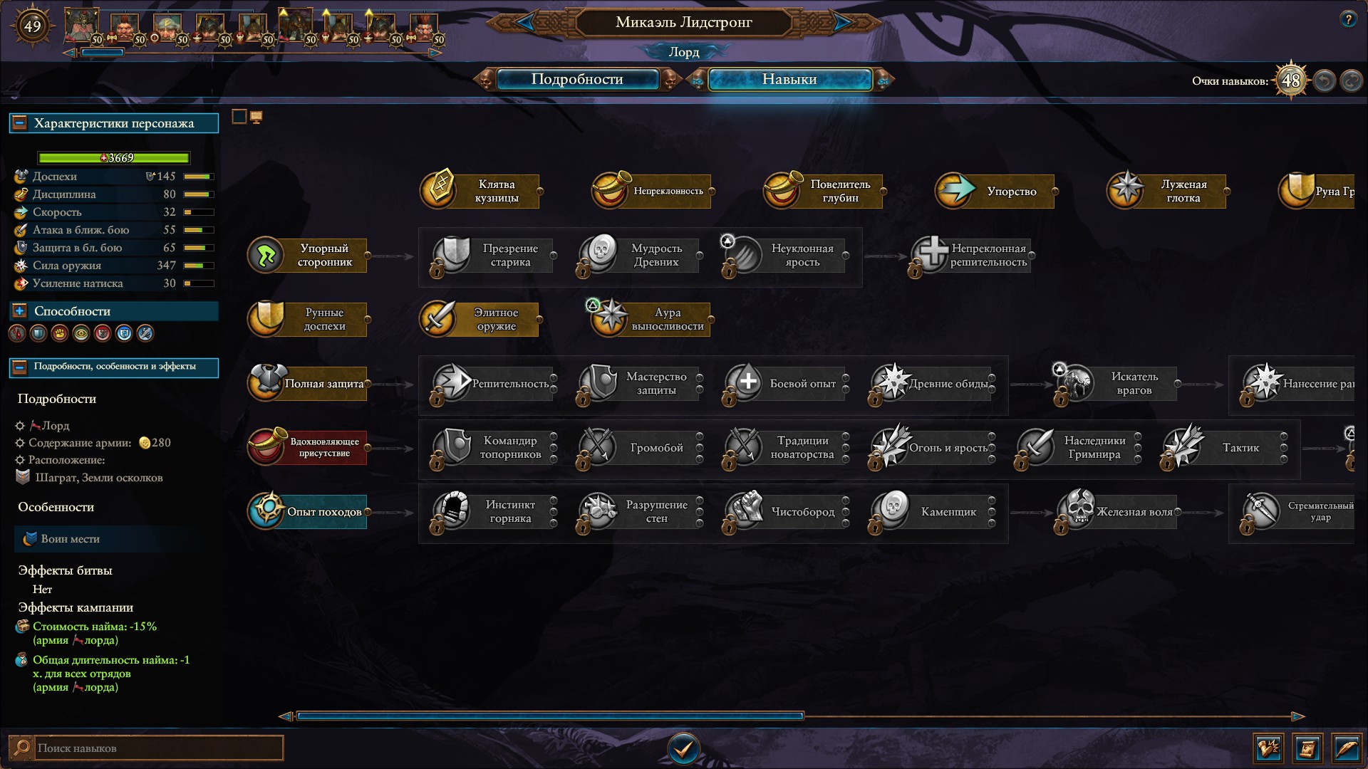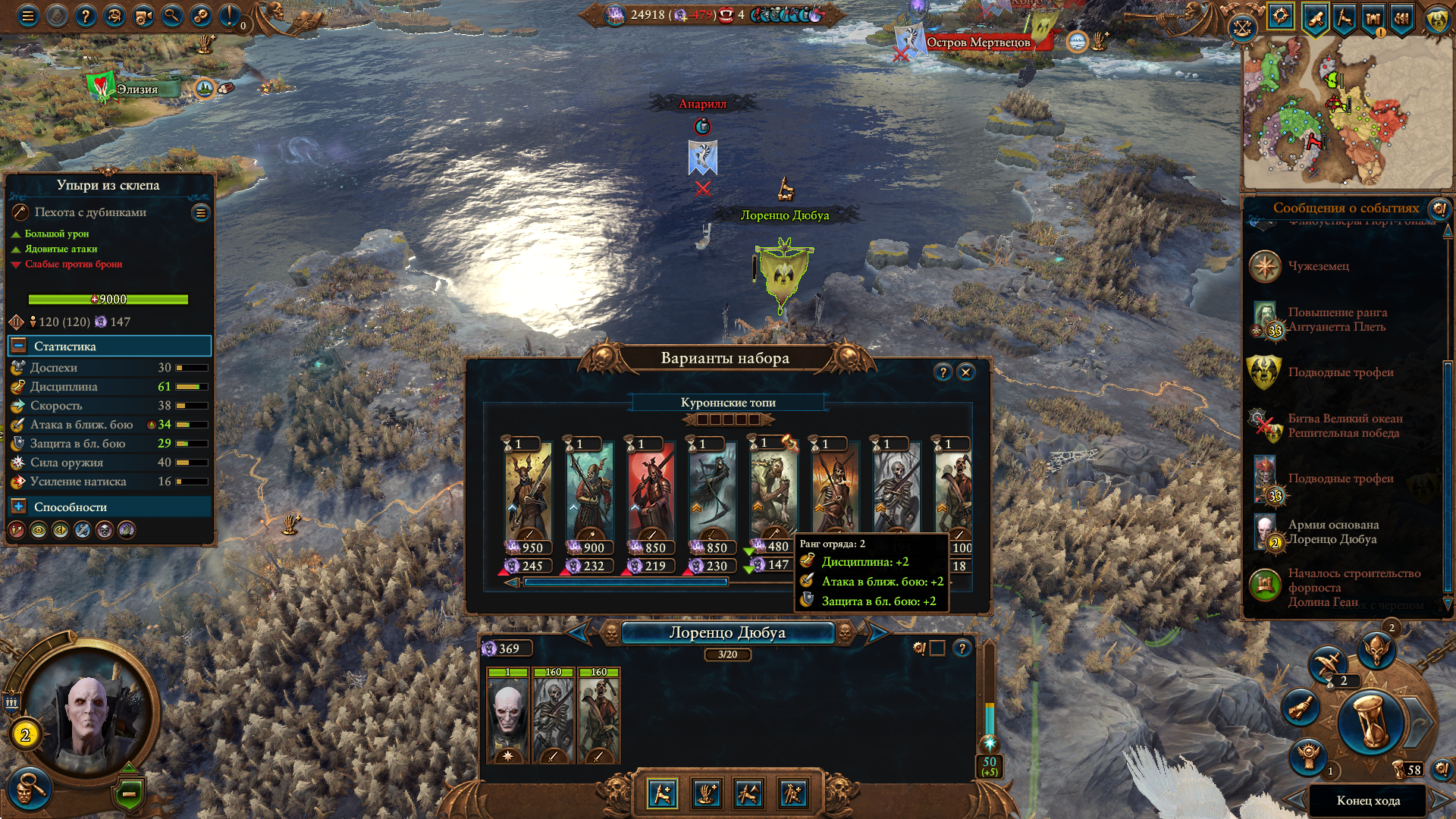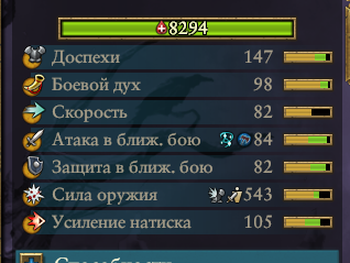 Армия состояла из Морати, Сюзерна, 8 пиратов черного ковчега шнепперов и 10 темных панцирей щитов, второй лорд маг огня. Под конец нанимал теней, но они очень дорогие, я не мог позволить себе экономически их.