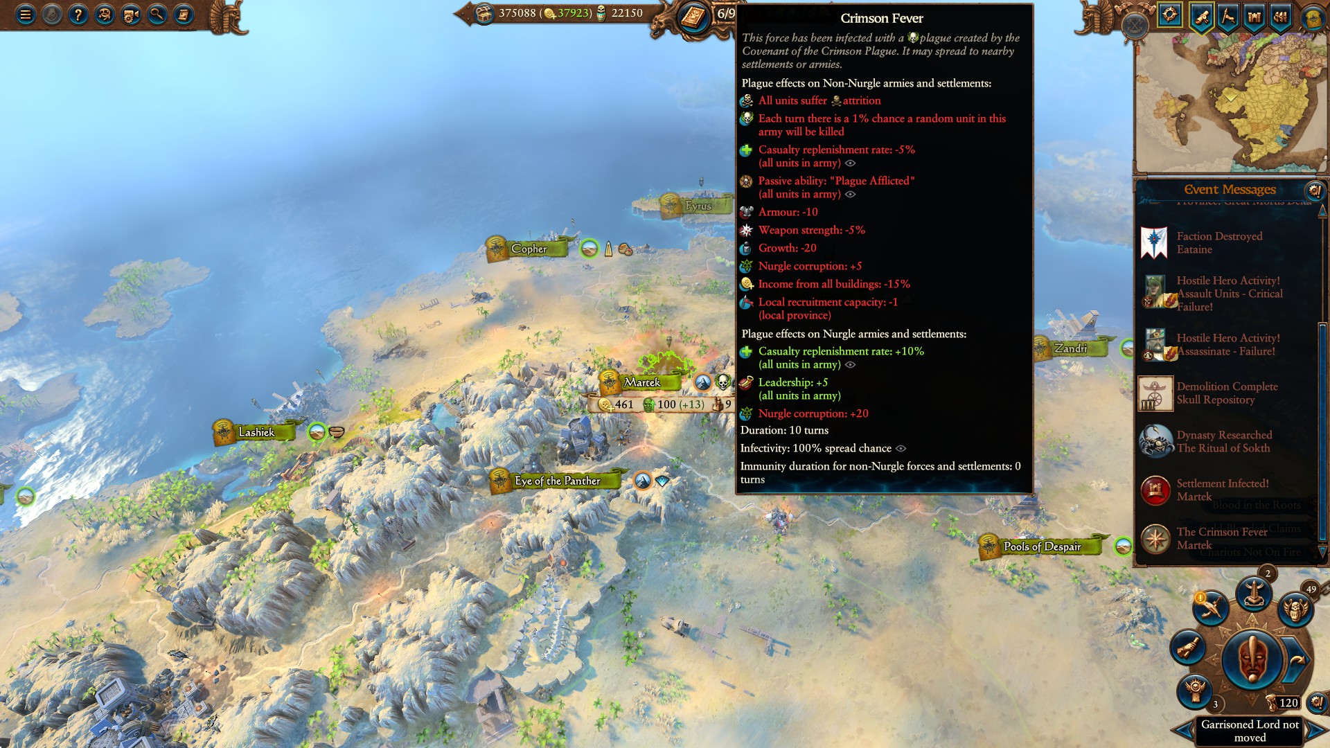 И как же Морати сосет. Я не смог захватить стартовую позицию, меня выебала армия бота, я потерял все и гидру в том числе. В итоге пришлось нанимать армию с нуля снова, кое-как захватил стартовую провинцию, в это время получил две войны от Нагарита и малого высшего эльфа, в итоге я пошел в контратаку на Нагарит и захватил его столицу, а в это время малый эльф напал на меня и захватил три города, я возвращался назад дефать столицу, отбился от него и восстания, возвращался в столицу Нагарита, меня ловит бот и разъебывает мою армию, нанимаюсь снова. В это время у сестер тоже не гладко столицу снес скавен, но в остальном у него была сильная армия с которой он пер на меня. Мне объявляют войну еще Маздамунди и Алариэль. Сразились в открытом сражении, я победил, но после этого меня добивает Нагарит, берет в осаду столицу и изи побеждает. Всего игра шла 30 ходов.