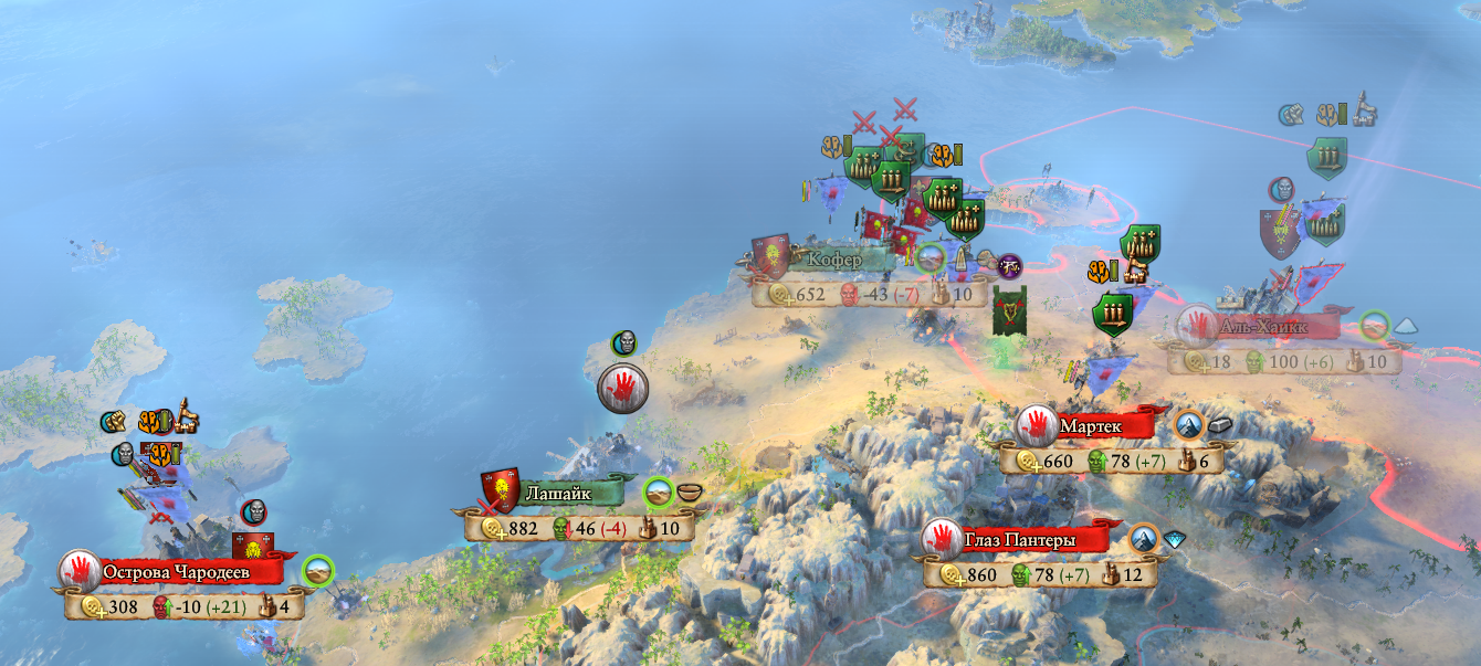 Кстати о Слаанеш, почему-то Скордж оф Кейн сидят в своей столице и ничего не делают. Я к ним культ послал, отношения отличные, защитный альянс, но они игнорируют любые кооперативные действия и с половиной армии сидят в городе 20 ходов.