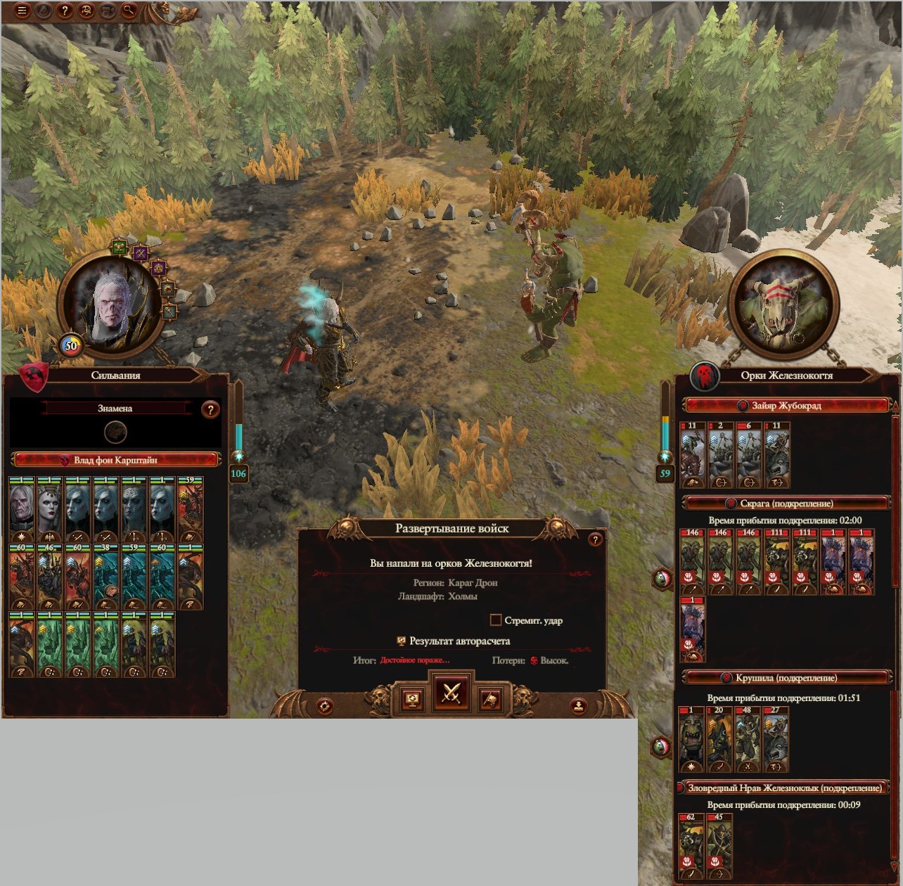 Играл пвп Морати против Сестер Сумерек, во время боев контролировали армии бота, сложность компании очень высокая, битвы средняя, правда во второй вархаммер, так как у друга не тащит 3. По встречам с другом по победам у нас 4:0 в мою пользу.
