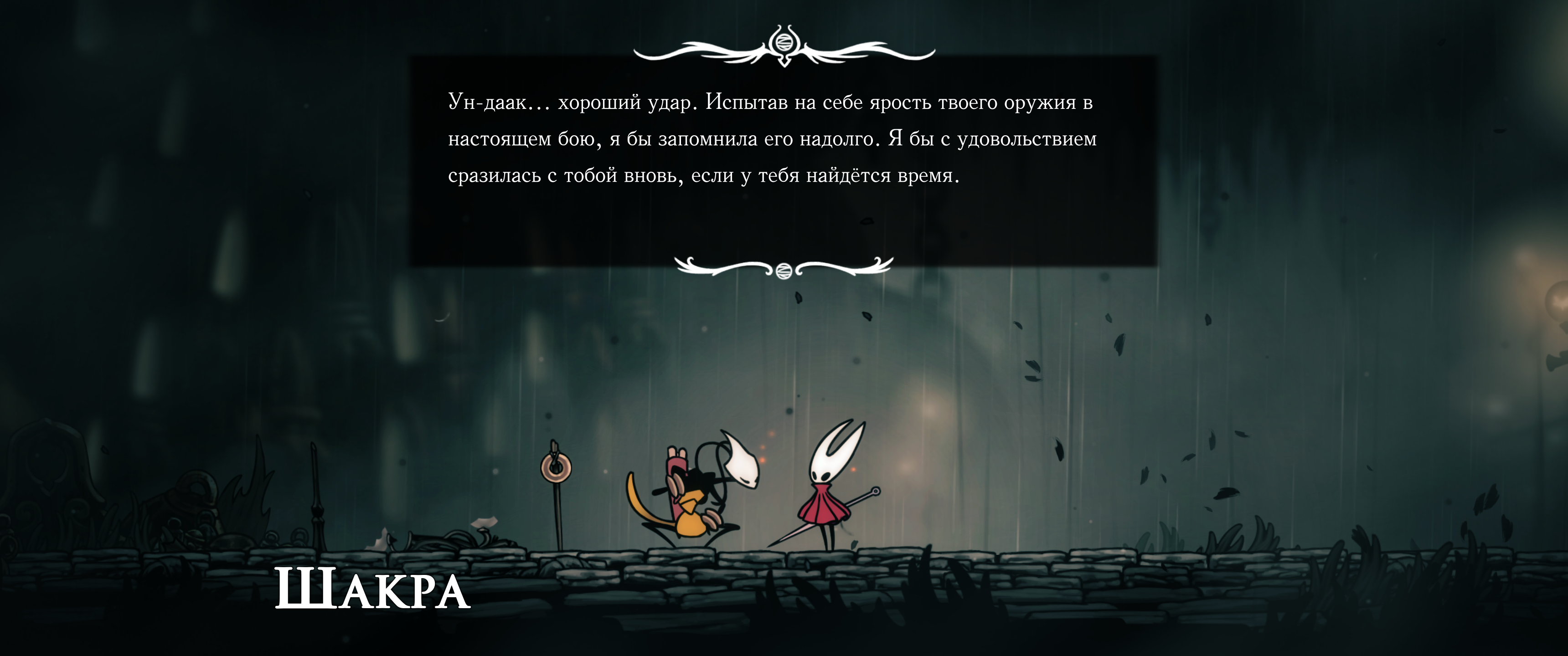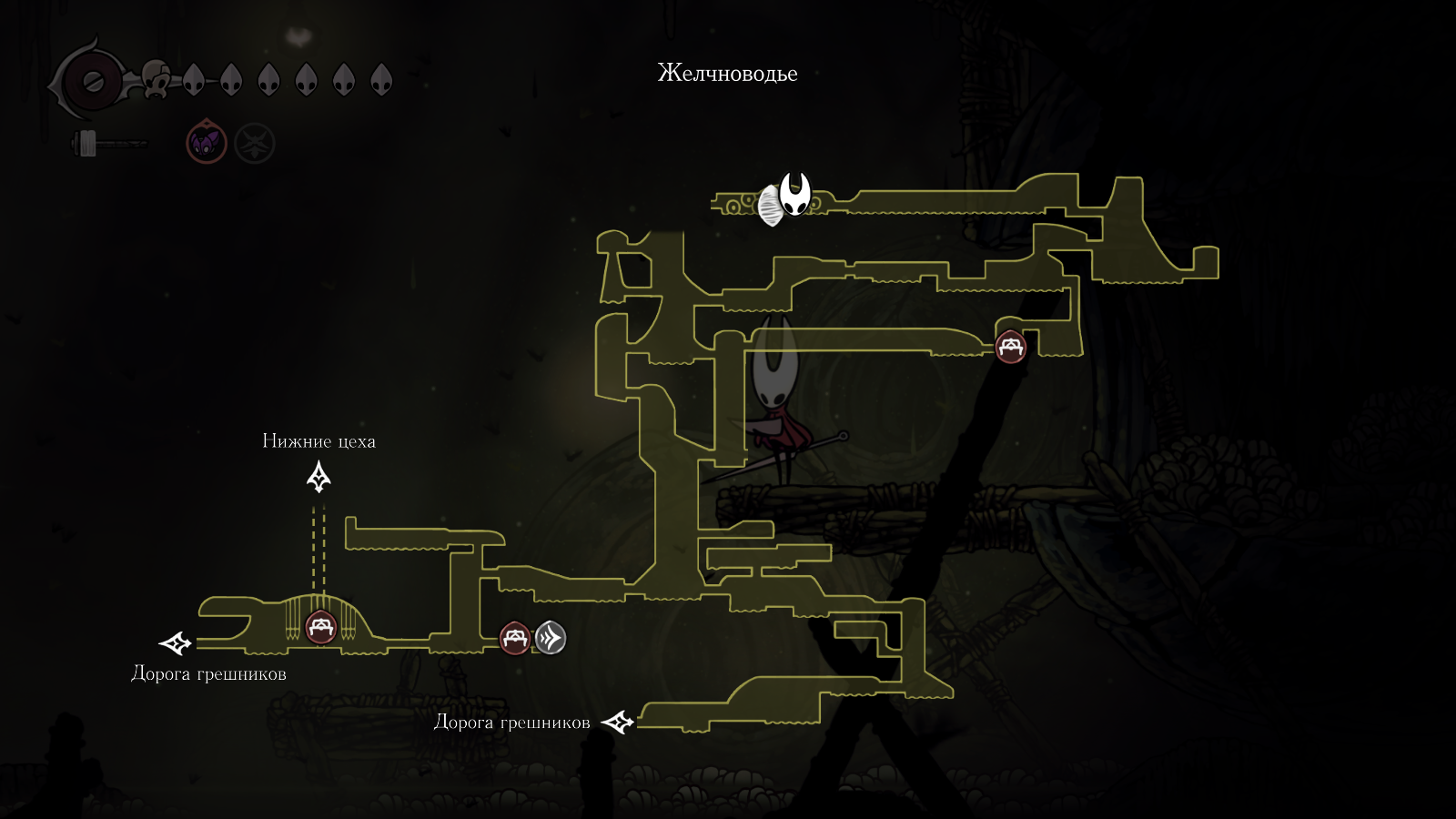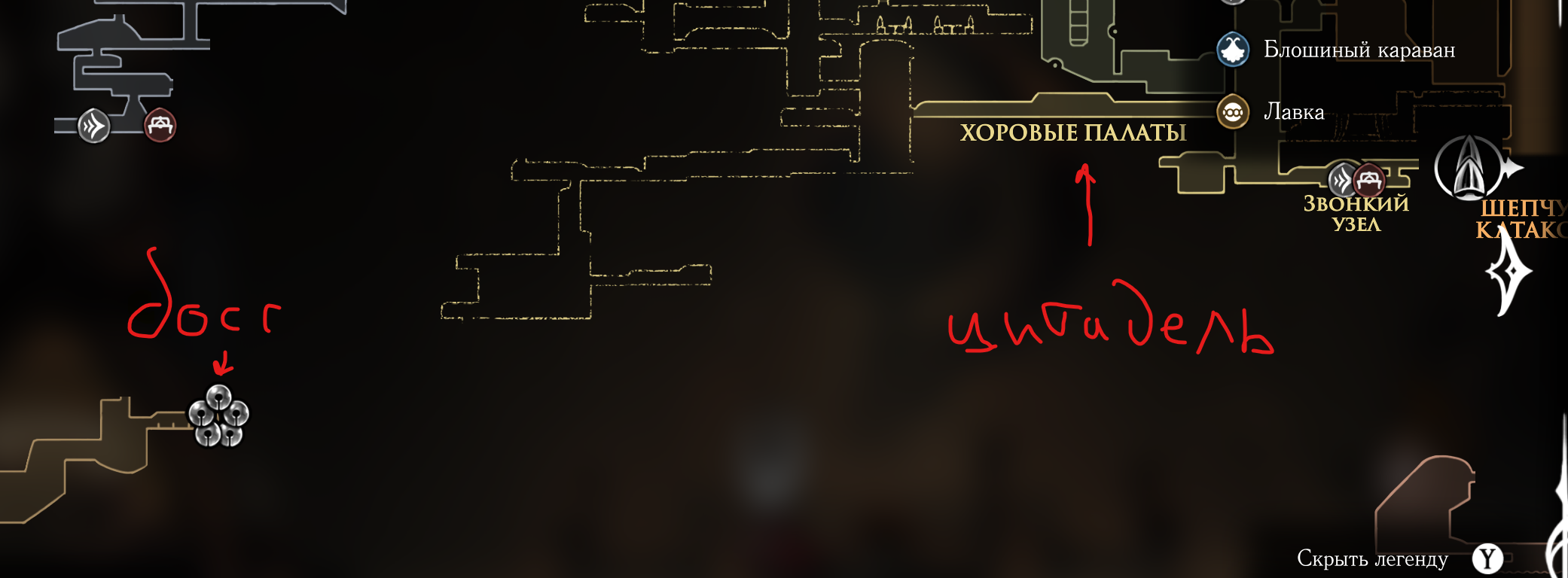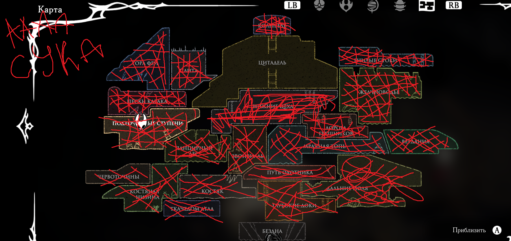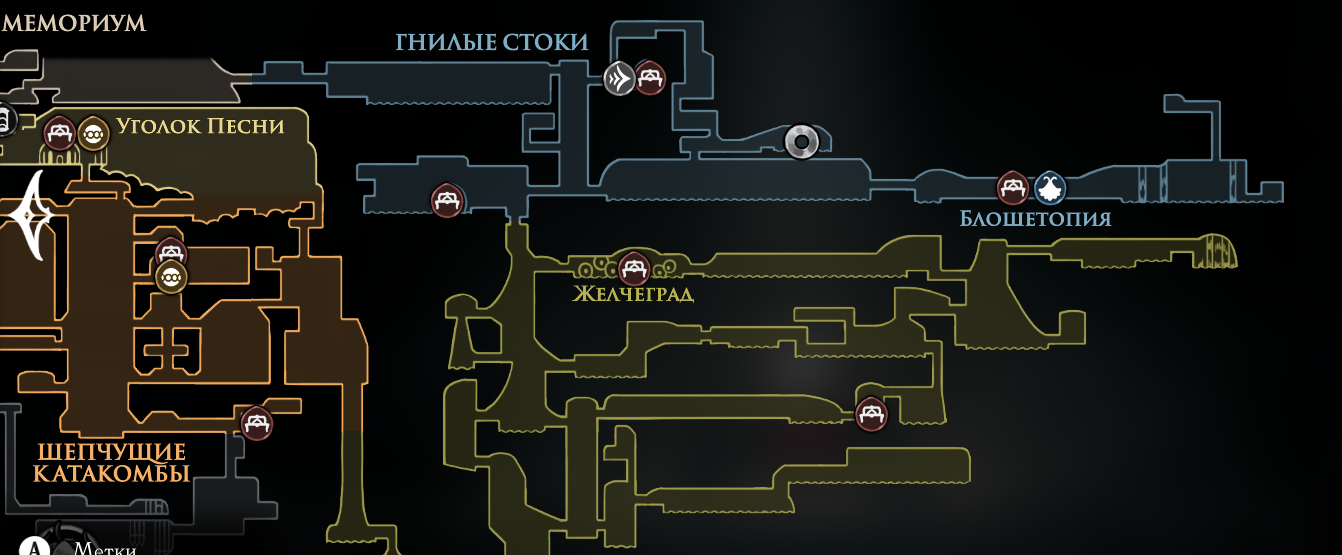 В первой части был полностью "логичный" фэнтезийный мир с логичной географией. У нас есть перевёрнутая вертикаль (что логично, жуки же подземники): наверху пролы ломают кристаллы, под ними спальный район, под ним - вокзал и кварталы для нитакусь (грибы), далее - местный ДС-сити, ниже - белый дворец и местные архивы спецслужб и бездна. С краёв карты - тупо края королевства, ветер, тишина, дикие твари, камни и всякие объебосы типа пчёл и отщепенцев-еретиков типа Джонни. При этом опасные локации более-менее в лоре: богомолы - дерзкие и гордые, но им это прощается, чтобы ограждать цивилизованный жучиный мир от его наиболее маргинальной части в виде глубинного гнезда (где даже до чумы Сияние было дохуя дикой живности), зелёная тропа внутри лора игры не была главным путём в королевство - по ней ходили паломники Унн, а так-то нормальные жуки приезжали на поездах сразу к столице. В Силксонг пока наиграл 40 часов, заканчиваю второй акт, но, чувствую, так и не узнаю ни лора комаров с воздушными шарами, ни огнепоклонников в бамбуковом лесу, ни какого хуя тут такие дикие перепады температур в одном месте, дождь во втором и сухо в третьем (в первой части дождь лил из озера наверху, а тут?)