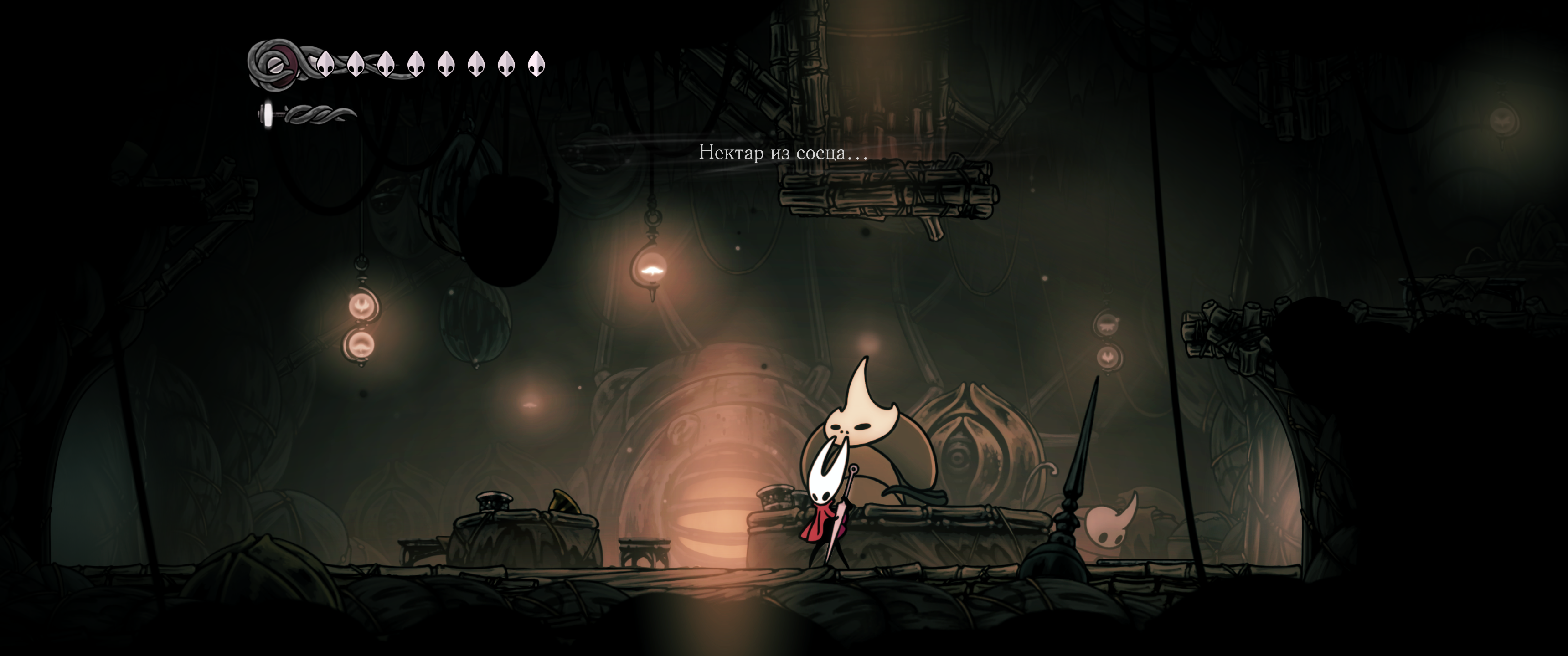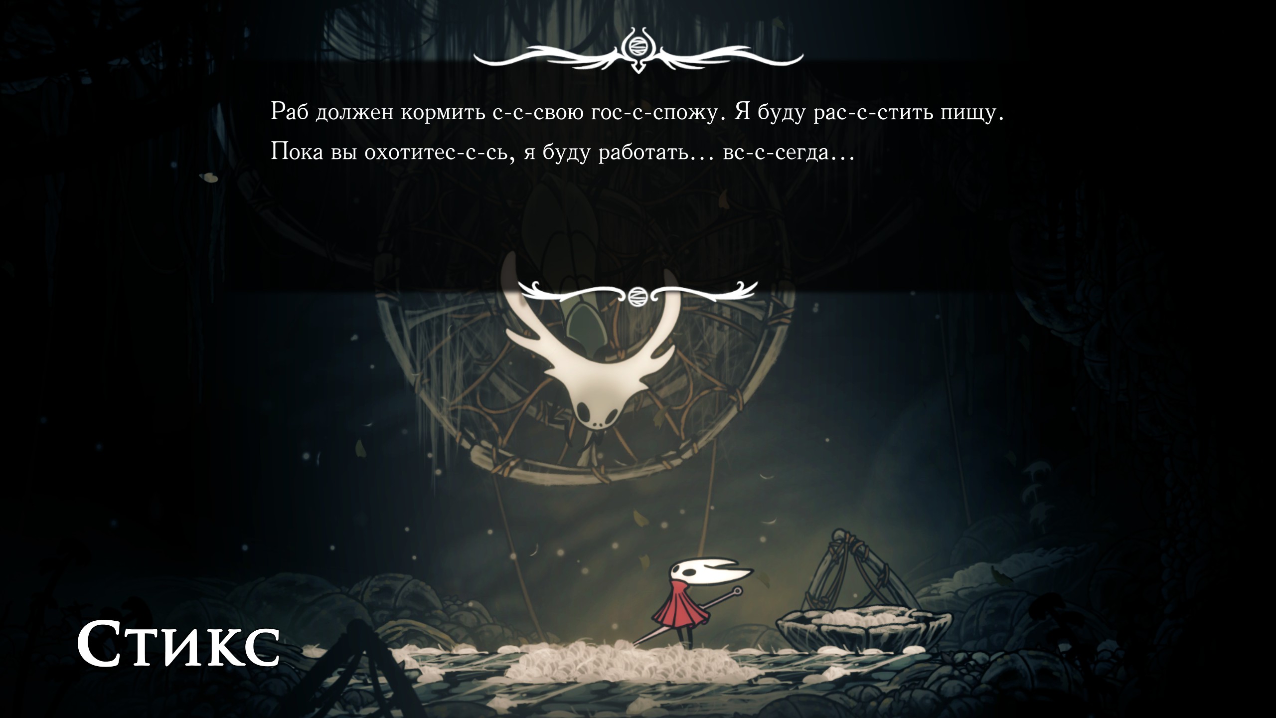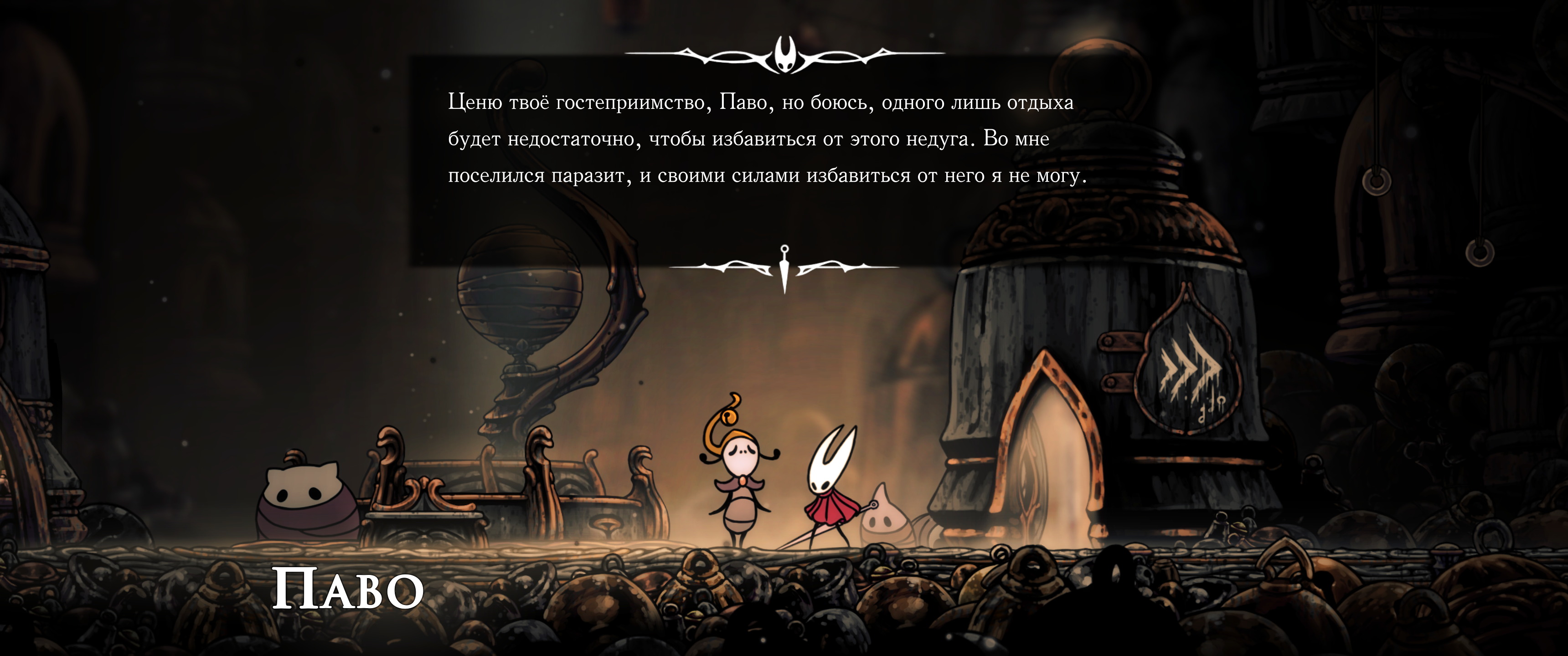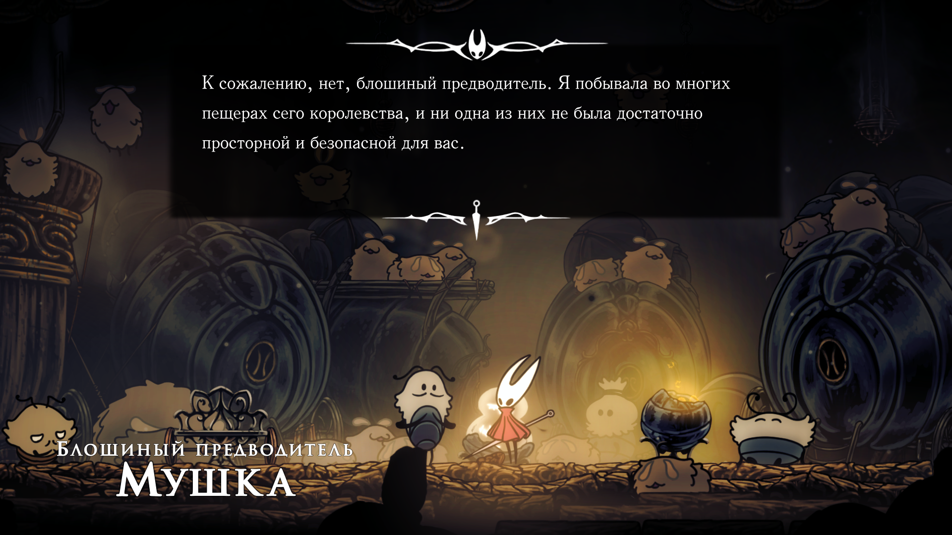 Кроме шуток, у Хорнет большущие проблемы с эмоциональным и социальным интеллектом. Я списывал это на то, что у неё по сути не было нормальной семьи, но скорее всего это у неё от природы, всё-таки какой-то мутный союз ткача и червя, может что-то поломалось. Скорее всего она в принципе не обладает эмпатией и ничего не чувствует во всех этих моментах в игре, где вы бы проронили слезу.