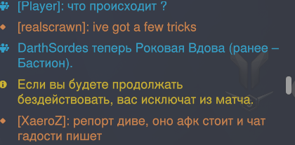 — если ты вежливо просишь меня свичнуть героя, то получаешь блок + репорт, если невежливо, то ещё и эвейд в придачу; — если ты просишь меня присоединиться к войсу, то получаешь блок + репорт; — если ты написал гг в конце матча, то получаешь блок + репорт; — если ты в принципе написало что-то, что мне не понравилось, то получаешь блок + репорт, думай дважды, чепуха; — если мне не нравится, как ты играешь, то получаешь репорт + эвейд; — если ты в моей команде и у тебя уровень <100, и ты не смурф (т.е. имеешь кд <4 в стате или не убиваешь пол команды врага в замесе), то получаешь репорт + эвейд; — если ты решило выгулять своего дружочка-лоускила в пати, то оба получаете репорты, а чмоха с самым высоким эло получает эвейд; Хочу заметить, что репорты складываются, то есть если ты плохо играешь и бухтишь в чат, то получишь два разных репорта, а так же получишь ещё копию этих репортов, если попадёшься со мной в следующей игре, даже если окажешься в противоположной команде.