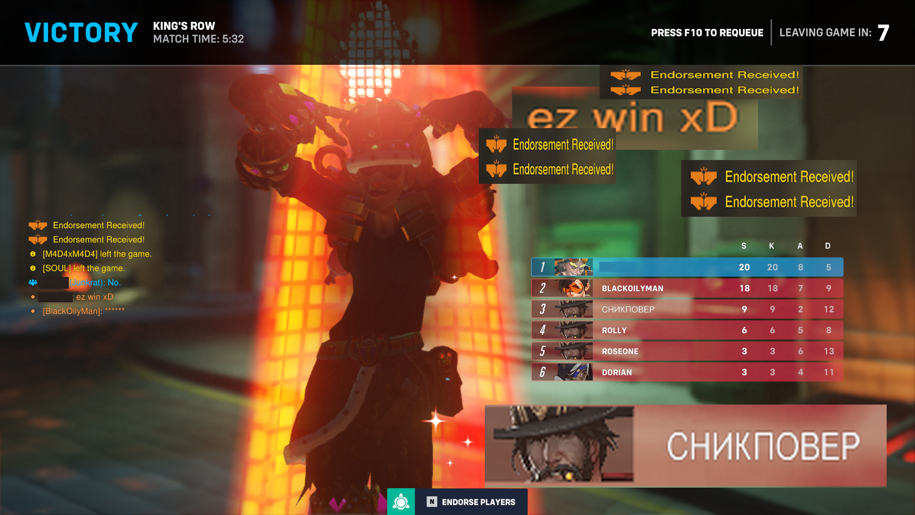 Я не репорчу за нестандартные пики, если ты полезен. Саппорты, которые были втором и третьем слоте (я мерсимейн) получают "гуд тиммейт" эндорс. Танки, которые хорошо прикрывали меня или перевернули ключевой файт, получают "шот коллер" эндорс. Дебилоиды на ДПС не получают эндорс никогда. Если ты был сильным игроком в противоположной команде, но тиммейты тебе заруинили, и при этом у меня есть лишний эндорс, то я даю тебе "спортсменшип". Если мы проиграли, то эндорс не получает никто!