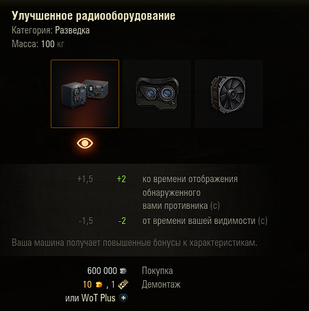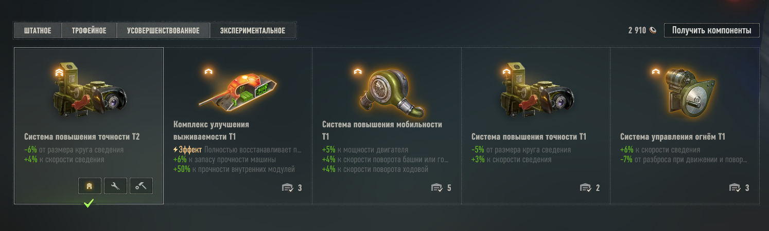 Вообще универсальный набор оборудования такой: ТТ, ПТ - вентиль, стабилизатор, досылатель.Исключение Маус, Тог-2, Трактор. Там вместо стабилизатора закалка. СТ - вентиль, стабилизатор, досылатель. Исключение ст с обзором 390 и выше там вместо стабилизатора и досылателя оптика и коп., ст с барабаном вместо досылателя, которого нет турбина. ЛТ - Вентиль, оптика, коп.