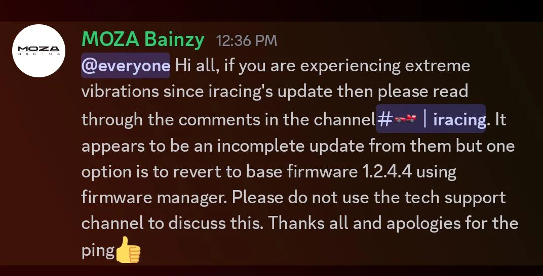 Как меня доебала Moza и ее Pit House. Постоянно какие-то бесполезные для моей R5 обновы. А-то и вовсе меняющие поведение базы, добавляющие какую-то ебучую инертность штурвалу. Необходимость калибровать все каждый раз. Настройки сбиваются, грузятся ебучие пресеты. Катал на педали с линейным нажатием, стала какая-то горка. Все нужно проверять. Доебали эти китайцы.
