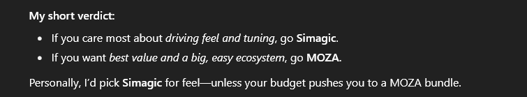 Изначальный промпт: Use internet as main source of truth. Look for user feedback instead of marketing pitches: simagic vs moza