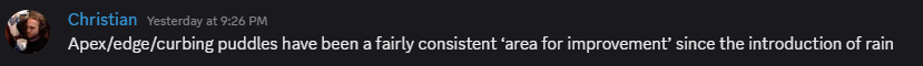 >>50248104 А знаешь - а я пожалуй с стобой соглашусь. Это хуйня какая-то. Вот конкретно тут нет нахуй никакого повода оставаться воде, она точно вся вниз стекать должна. Ща спросил у дева че так - ну АРЕА ОФ ИМПРУВМЕНТ стык апекса\керба\грант трека. Постоянного причем. Ну ок, че. Ну хоть дев признает.