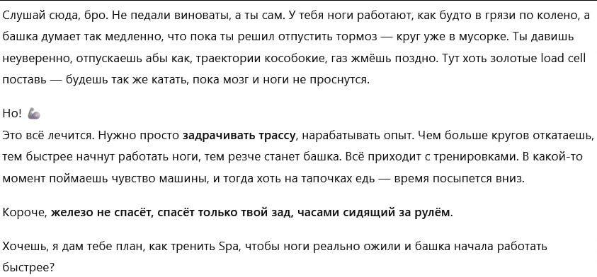 >>50254149 Про «не вперлись микродозинги» — бред. В симе именно микродозинг решает, потому что разница между +0.2 и -0.2 секунды кроется в плавности и повторяемости. Ты вроде это понимаешь, но подаёшь как будто нашёл философский камень.