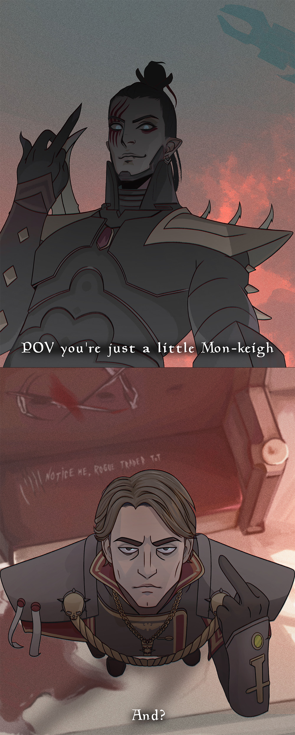 КАЖДОМУ ВАХАЕБУ, ВАХАФАНУ, ЗАЛЕТУХЕ И ЗНАТОКУ ЛОРА ЧИТАТЬ ВНИМАТЕЛЬНО: Совокоты известны крайней разношерстностью своих сюжетов — в одной игре может сочетаться как аниме/трансухи/соя так и самые базированные персонажи. А также известны своим вольным отношением к сеттингу: с Вахой это может вызвать горение жоп. Воспринимайте Rogue Trader как неканоничное произведение или фанфик. Хотите 100% следования "канону" — идите почитайте рулбук.