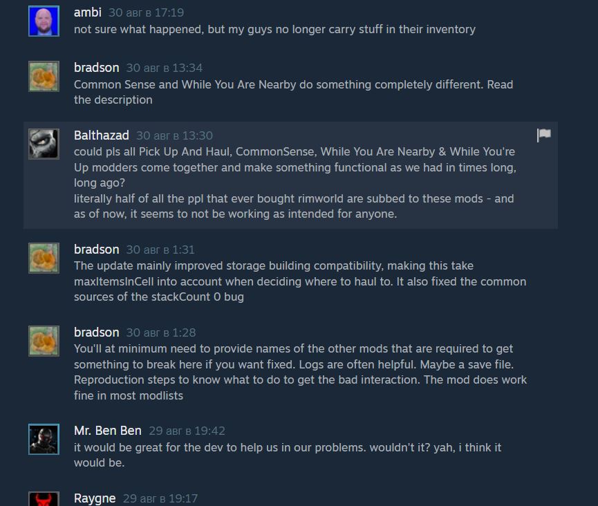 >>50237594 >Я пробовал, но там логистика говна у пешек, ажно бесит. С новыми лоад/анлоад стейшенами нормальная логистика, но 1) когда с ней, точнее с количеством грузчиков, возникают проблемы перестраивать под неё "старый город" совершенно не хочется 2) автоназначение работников на склады и haulerы работает ужасно. Хорошо, что для комплексов мастерских можно промежуточные товары складывать в безлюдный hauler силами самих работников. Ну и туда же избыток конечного продукта. Что мешает им тащить на склад через дверь с в 6 раз большей вместимостью на клетку? Да хуй его знает.