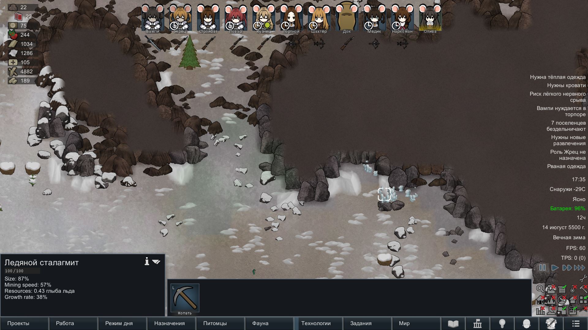 И если медь не проблема, то с бронзой всё куда сложнее. За всё время нашёл немного олова, слитков 6 бронзы вышло, немного цинка и висмута(висмута знаю где накопать, но с цинком вообще голяк, так что висмут мне без надобности), получится ещё слитков 5. Случайно наткнулся в кварце на серебро, много серебра. А пока гулял, так же в кварце случайно наткнулся на золото. Хватало на 10 слитков, или можно было сразу сделать наковальню. Я посчитал, что топовую бронзу как-то жалко для наковальни и пустил на инструменты. Это было ошибкой, ведь гуляя я случайно ёбнулся в штольню и нашёл просто кучу железа, я столько руды ещё никогда не видел, копал её там 2 дня, даже темпоральную шестерёнку заюзал, чтобы кукухой не поехать. Только вот теперь это железо не на чем выковать из крицы, нужна бронзовая наковальня. Пойду на место, где нашёл золото, мне его совсем немного надо, буквально на 4 слитка чёрной бронзы, сделаю наковальню.