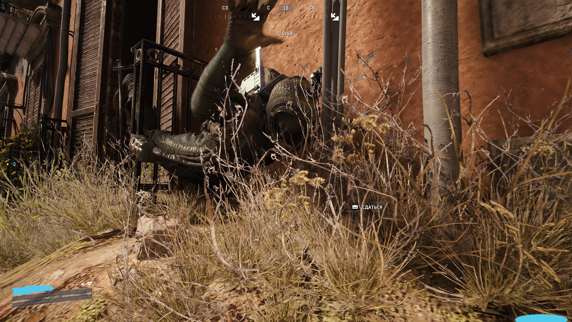 помог типу убить какую-то ракетную летающую хуйню, но она меня подбила, заползаю в лифт на карачках, чел прибегает активирует его чтобы он уехал и расстреливает меня.