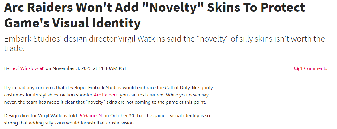>>50410865 >Лучше купите тарков ну пожалуйста Тарков это мейнстрим жанра. Именно жанра в смысле геймлупа - выход в рейд, выживание, пвп, лутание, экстракшн. Нет ничего плохого в том чтобы сравнивать игру с родоначальником жанра, от которого она и пытается откусить аудиторию. Как например сравнивать апекс с пабгом в жанре батлроялей. Апекс смог откусить аудиторию потому что принёс в жанр много нового. Арк ничего нового не привносит.