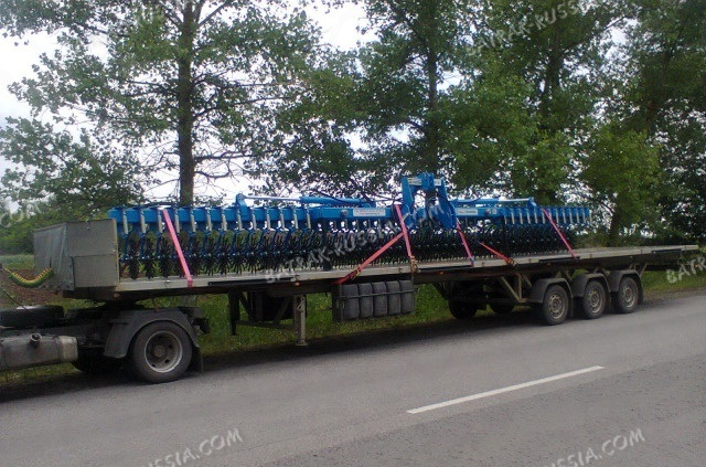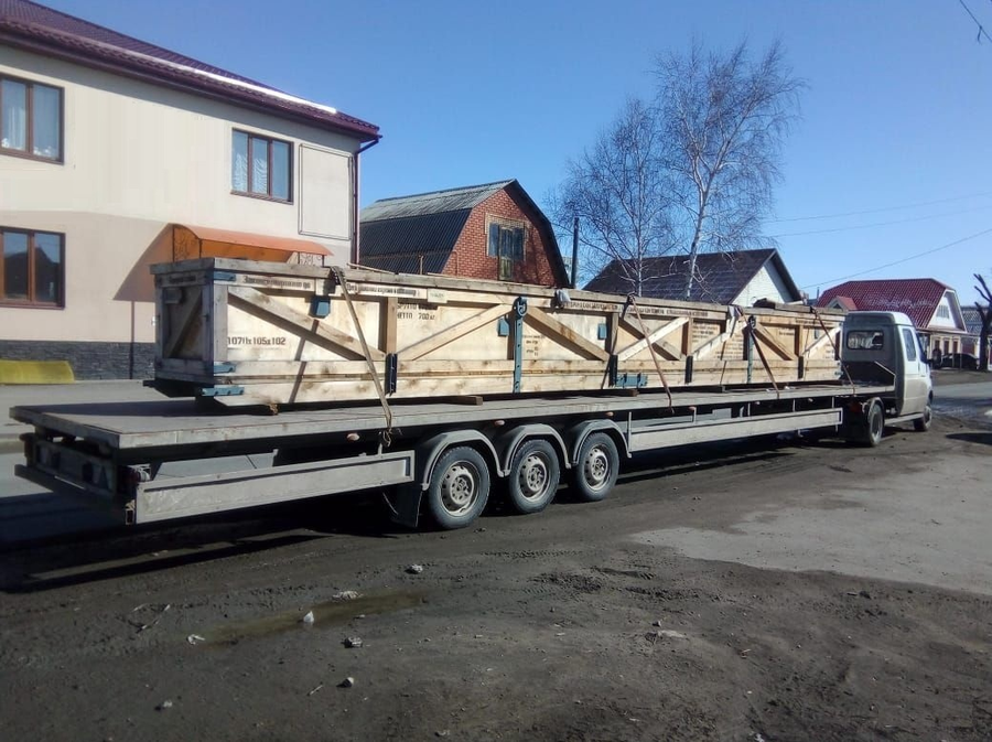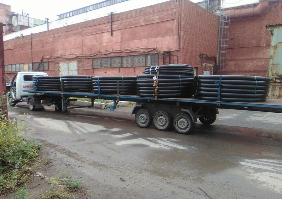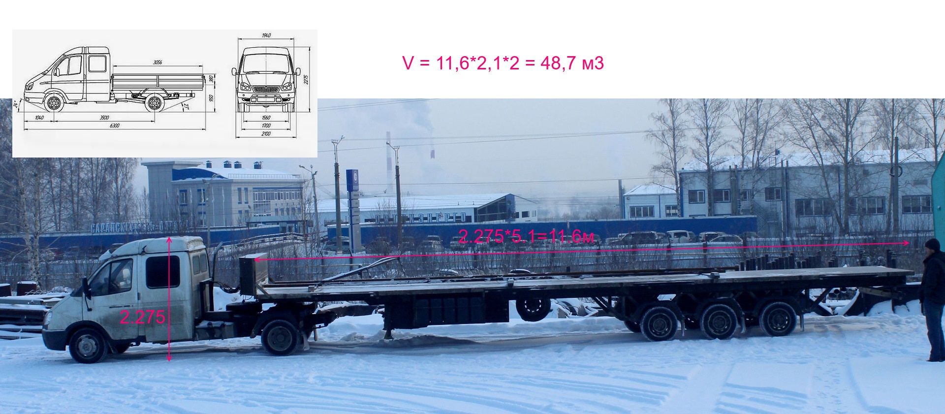 Второй вероятный сценарий: длинномерные грузы вроде профильной трубы. Судя по отсутствию бортов на шаланде, тут как раз такой случай. Возьмём, например: труба квадрат 100х100х5 мм, вес в среднем 14,5 кг/п.м., длина 12м (пусть свисают немного в пределах ограничений ПДД, повяжем красную тряпку на конец). В ширину платформы таких уложится 20 штук, так что в 1 слой имеем 122014,5 = 3480кг. Итого как минимум в 2 яруса трубу можно везти.