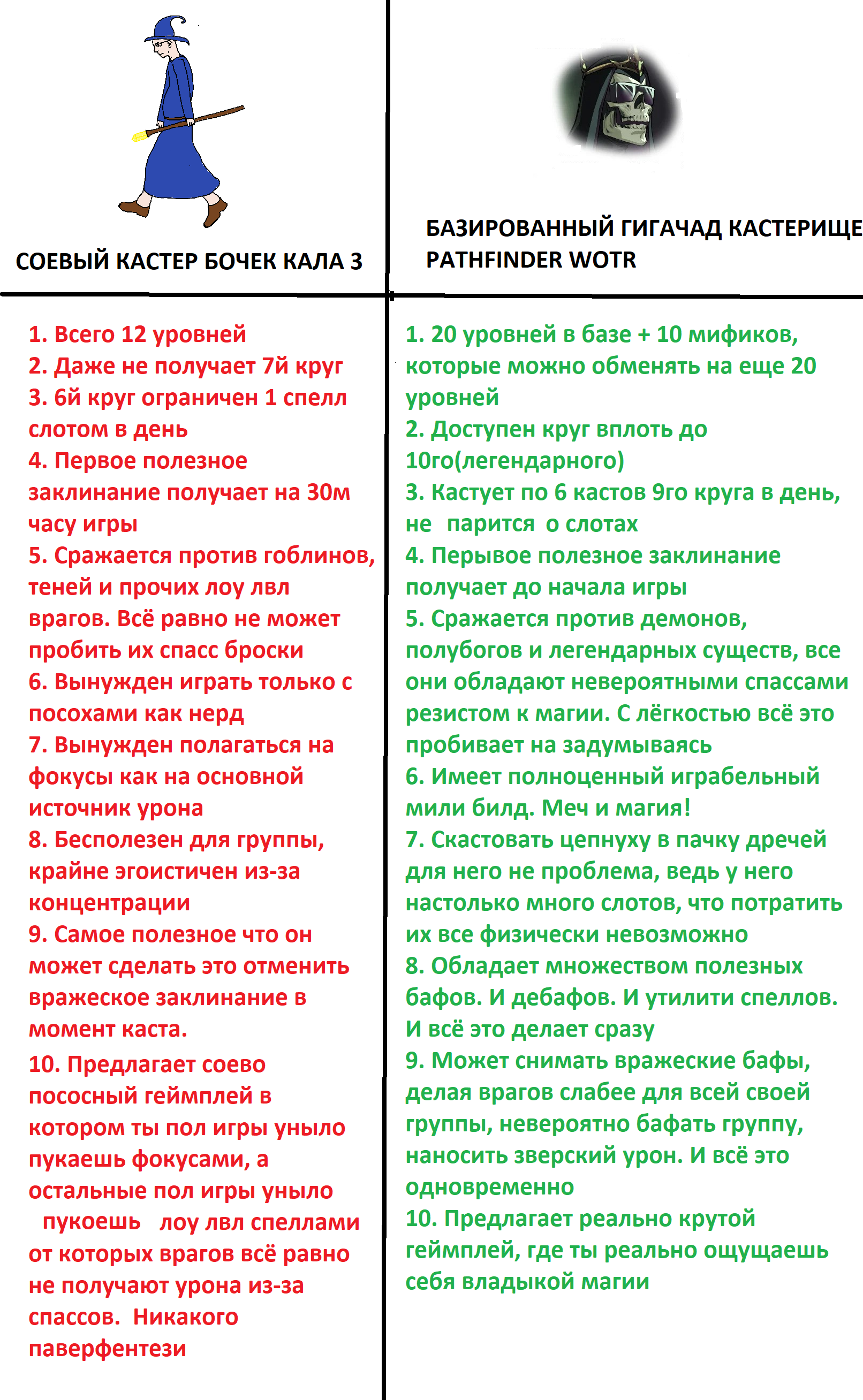 >>50404902 >следопыт шляпа ебанутый? самый сильный лучник игры с 1 уровней, а не как бард который только с 6лвл что то начинает >чародей хуже волшебника потому что не может изучать магию со свитков ну точно нубас. Свитков в игре хоть жопой ешь, а если не хватает обновляешь магаз и скупаешь нужные. Учить их нет смысла. Тем более у тебя не дофига ячеек что бы кастовать всё подряд. А нужные спелы волш учит и так. их не так много. А метамагии у него нет. Кастануть ускорение на 2 союзников волш не может. Выдать ДВА фаербола за 1 ход он не может. итд. и ещё про спелы. У тебя респек стоит 100 голды. Заплатил и выбрал нужный набор заклинаний сорку.