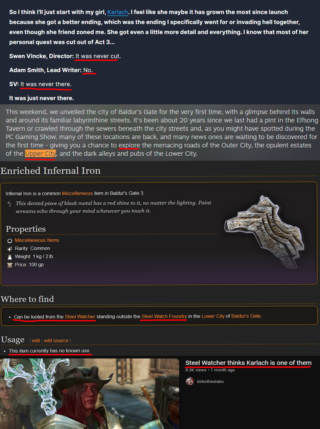 >>50419765 > И мне кажется, но она в конце недоделанная? Не кажется. Из игры вырезали примерно одну треть необходимого контента. В 3м акте должен был быть еще и верхний город, а так же поход в Аверно. Из игры вырезали прям ОВЕР дохуя - ковен ведьм, квест Карлача, верхний город, сюжет ку чихлингов-беженцев и конкретно Мол, сюжетку Дейзи скрестили с сюжеткой Императора. Короче очень много. > И я не понял кто такой иссохший по итогу. Джергал. Бывший бог смерти, который раздал силы и стал мелкобогом на подсосе у нового бога смерти. >>50419778 > А в самой бг3 это можно как-то понять? Да, можно, Там где ты его находишь можно пройти чек на религию и узнать что это его храм, а так же найти свиток где описывается встреча с ним и там он описан как в игре. Паладин с клериком могут его ауру почувствовать еще.