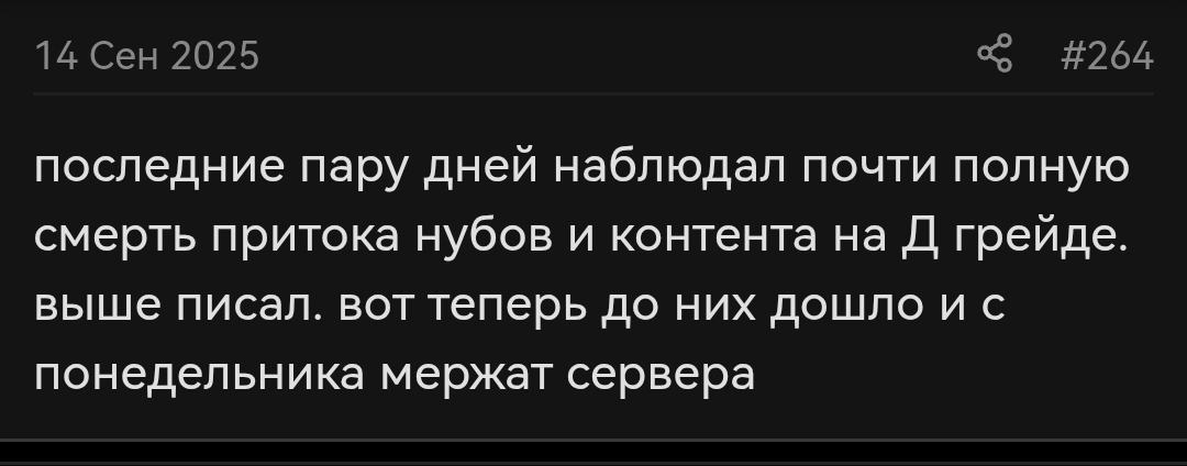 Закатился на самурая потамагочить в долгую, забайтило что 20 часов в сутки там пве, да и в пвп время никто не трогал, для тамагочера ваще кайфуха. Даже 5к залил на "пассы", на которые можно в месяц в сумме 10к потратить. Ну так вот, выяснил, что у фритуплейщика дофамина примерно 0, развития вообще никакого. У работяги, что на ступень выше фритуплейщика, весь дофамин - развитие раз в месяц за 10к лимит доната месячного, что тоже вообще не густо. Единственный кто получает удовольствие от развития - чел с большим кошельком, который может бесконечно вливать и буститься (нахуя? я не знаю, игра мертва давно). В общем-то это всё и так известно, но вот захотелось говнеца похавать, что поделать, да и интересно было посмотреть на изменения офовского эссенса спустя несколько лет. Вывод сделал, что на офе вообще нехуй делать работяге, за дофамином надо идти на эссенс фришки, но беда в том что они живут по паре месяцев. Ну, либо идти в мобилки, там разрабы щедры на дофамин для фритуплейщиков.