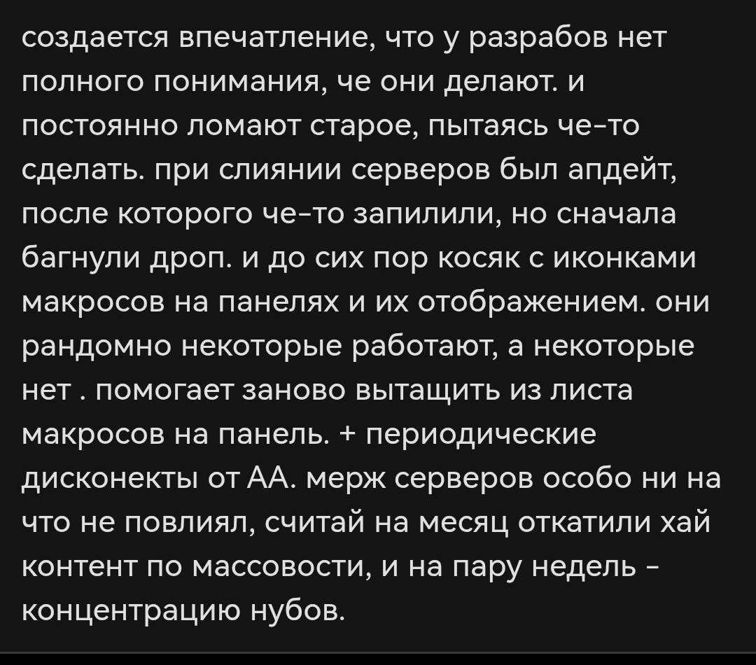 Моё мнение таково, пробелема сруча это то, что они уже заебались тянуть лямку и просто погнали за деньгами. Если бы он выкатили графоний, но стконцепцией харбора на основе локаций с1, впили туда наработки братков заднеприводных. Сделали бы ставку на Олимп, осады, возможно некие квесты ежедневные с проследующем добавлением локаций с хроник выше, у них бы было время их проработать это были бы прям полноценные обновления которые бы ждали, но пока ждали было бы чем заняться. Думаю даже рейты ниже х1, но с каким то ежедневным контентом дали бы жизнь. Но получилось что имеем, каждый ради бабок готов нарушить принципы, я их не обвиняю, мивину тоже забывает кушать