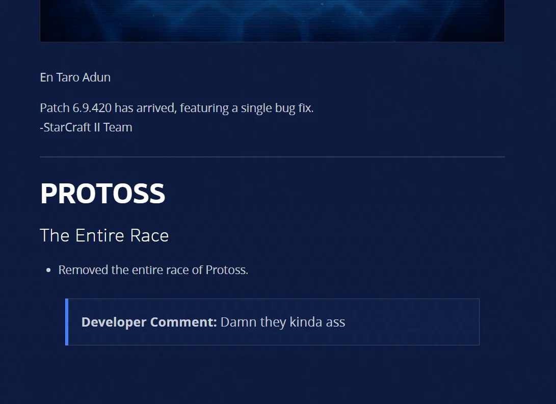 Не зря дропнул протоссов пересев на терранов. Эти еблазавры реально нерфят блядь расу которая нихуя не может выше МЛ физически, хех, что за дегенераты, пизда. Ещё и дегенеративных жуков апают, классно, хули.