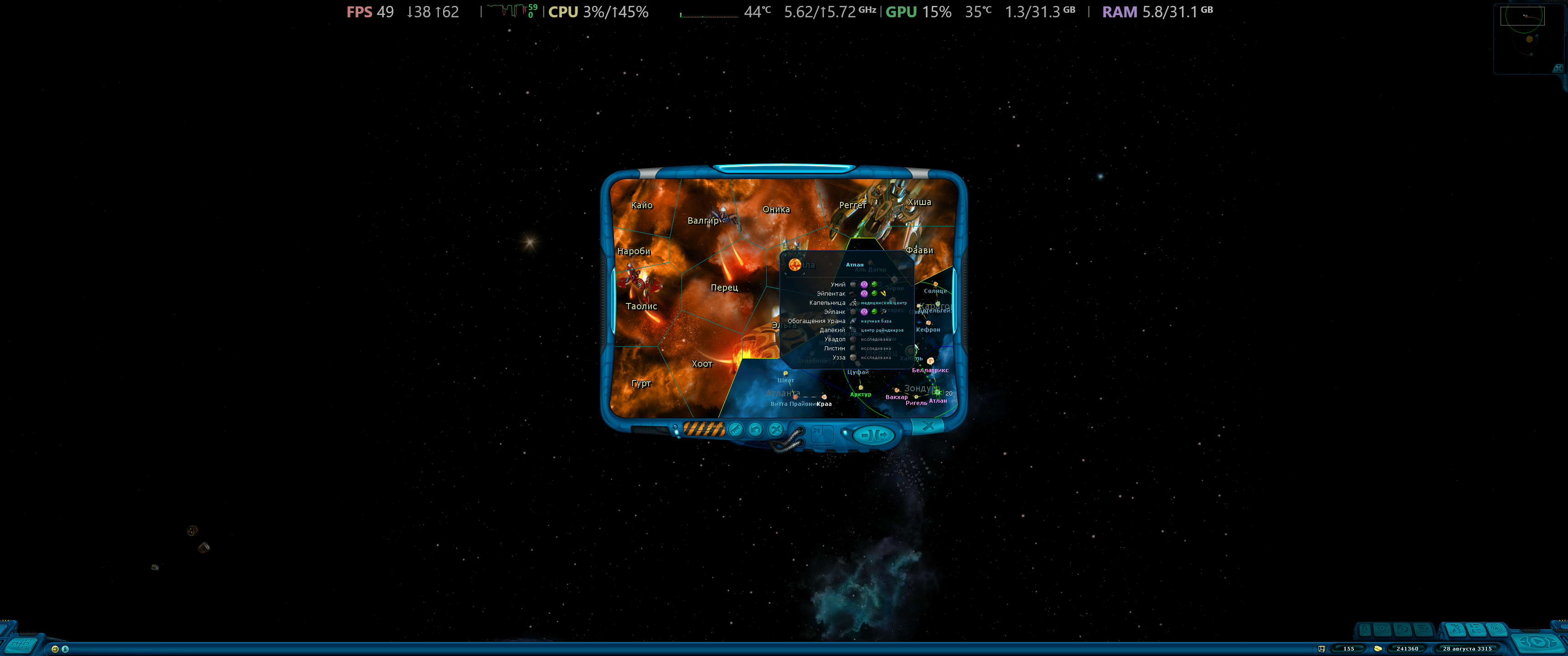 Однако, в модах Коалицию усилили, у нее теперь есть флоты и куча линкоров с дредноутами, поэтому 500%-ые доминаторы ее хоть и ебут, но не настолько. В итоге 25/25 за Коалами и Пиратами, остальные 50% за доминаторами. Плюс я еще накатил мод на 100+ систем, так что карта галактики щас выглядит вот так.