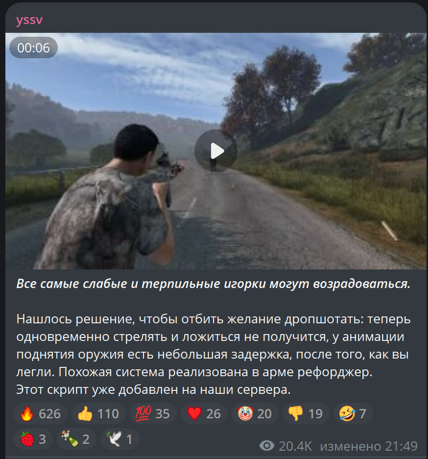 YSSV: Сейчас параллельно монтажу помогаю Дампеку записывать выживание. И скажу, что пока сидел последние пару месяцев в монтажке, в игре будто бы произошло нашествие просто конченых уебанов. Я прекрасно понимаю, что началось это не сегодня и не вчера, видимо, очень везет на них, и играть просто отвратительно, все насмешки, которые были над киберспортивными серверами с возможностью на них мунволкать, дропшотать, куешить и прочие уебанскиепрелести, стали реальностью для обычных серверов. По мимо того, что этим говном занимается огромное количество игроков, так и контентмейкеры не отстают, уподобляясь в нормализацию этого говна. А видя, какие потребности у сообщества, всё больше серверов делает уклон в калоедство, поощряя подобный геймплей и никак не ограничивая животных. Фрагменты на видео, кроме последнего отрезка, это одна и та же ситуация и один и тот же человек. И вот у нас с друзьями возникла дискуссия: — можно ли банить подобных людей? Например, в рамках вашего взгляда на это. — если можно, то по какому пункту правил? — если такого пункта правил не существует, то как оно должно звучать? — и стоит ли вообще бороться на уровне сервера с подобными животными? Возможно, если мы не одни такие ебаныеворчащие деды, не выкупающие за крутость пойти под фонк «разьебатьдропшотая пару терпил на сервере», ваши сообщения о том, как вы к этому относитесь на самом деле, могли бы помочь начать двигаться в сторону осуждения подобного геймплея со стороны игроков, а со стороны админов и серверодержателей перестать поощрять или закрывать глаза на таких игроков. Наверное, слишком жирно говорить о какой-либо массовости, но хотя бы в рамках одного проекта серверов. Я понимаю, что этим должны заниматься разработчики, но такое на северах видеть совсем не хочется.