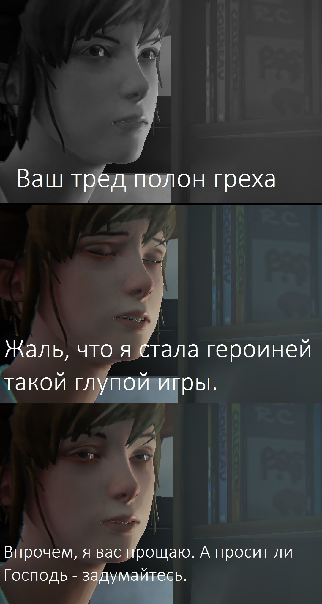 Во рофлан если они в не успевали и в попыхах дописывали сюжет и прочее D: Я пиздец разочарован, да я знал что меня ждет, игра для пубертатных девочек, ну дело даже не в этом, тут буквально похерили все, первый эпизод был интереснее и пытался нагнать чего-то... Кто-то говорил что записи это их новая франшиза, мб они хотят ее доить как лис, но черт... А ведь реально можно было все пофиксить если в конце Кэт стояла уже взрослой или Свонн откатилась назад до юности или показали прыжок в яму, бля...да пошло оно все в пизду, грустно нахуй(