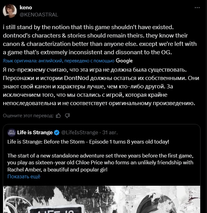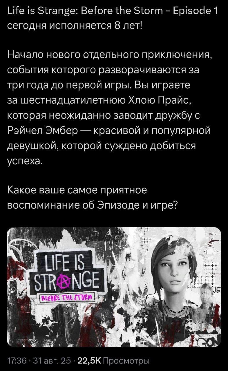 1 место. Life is strange. Играть впервые было очень круто, но и перепрохождения доставляли удовольствие. Крутые персонажи, ненавязчивая повесточка и гомосятина. Все режиссерские решения, которые ты видел в первый раз. Игра максимально доставила. Да и фишка с полароидными фото добавляла шарма. Но главное - механика перемещения во времени, которой лишились все другие игры. Это было круто. Именно то, чего я хотел в других играх, но так и не увидел. Атмосфера тёплого лампового кампуса - большой плюс! 2 место. True colors. Да, перемещений во времени нет. Зато есть приятная героиня. Новая механика не вызывала мурашек от возможностей, но вполне сойдёт. Многие сюжетные решения типа галюцинационных диалогов с мертвыми уже не удивляют, так как были раньше. Амосфера маленького закрытого городка - большой плюс! 3 место. Before the storm. Не переигрывал в неё аж с 2018 года и совсем не помню о чём она, на третье место ставлю только потому что LIS2 вызывает рвотный рефлекс. Помню лишь отдельные сцены - например постановку шекспировской пьесы. Не играл слишком давно и надо перепройти, потому что совсем забыл сюжет. Ну кроме того, что нам показали ту самую Рэйчел, о которой столько говорилось в первой части. А ещё там, кажется, вообще не было суперсилы, если не считать суперсилой способность героини как-то особенно говорить в отдельных ситуациях. 4 место. Мексиканские мигранты. Роудмуви вместо тёплой ламповой атмосферы одного кампуса. Куча злых белых цисгендорных персонажей. Пиздюк, который вечно не слушался брата и тем самым руинил игру. Заставили играть за парней выместо ламповых тяночек! Единственную ламповую тяночку показали только в начале! Просто ужасно!