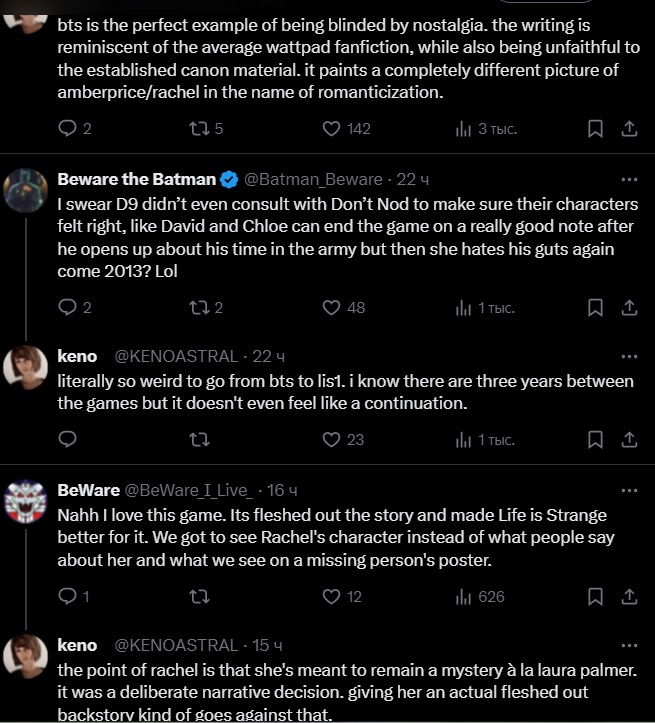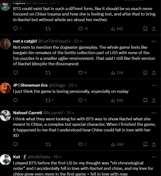 Я так понял они многое порезали, судя по сценам из трейлеров, тизеров, которых не оказалось в финальной игре, и прочему контенту, а также переносу обеих кассет несколько раз, игра должна была быть длиннее и более наполненной, но бюджета не хватило или времени, хер знает, в итоге зачем-то не просто порезали, а все луз энды оставили, сделали открытую концовку с клифхэнгером, якобы на сиквел (который хуй знает выйдет ли) или какой-нибудь комикс (умоляю, не надо). Я прям чувствовал всю игру, что где-то кусков не хватает, а где-то куски слишком затянутые для увеличения хронометража. Как будто тут даже текста меньше в сценарии и нет такой глубины, как в ЛиС. С дырой девки как-то странно взаимодействуют, не пытаются разобраться в природе дыры и что она делает, как влиет на них самих, игнорируются очевидные кричащие детали типа подсказки по открытию кодового замка в хижине, которую написала, видимо, Кэт, а потом прихуячила своим перочинным ножичком. Взрослых в игре нет, персонажей мало пиздец. В том же лисе было насрано охуеть как много разных персонажей, связей между ними, у всех характеры разные, позволяло между эпизодами строить ебанистические теории и находить подсказки. А тут девки по сути просто хуйнёй маются всё время, симулятор подросткового пинания хуёв без мотивации, серьёзной драмы, кризиса, дилеммы или чего-то такого. Даже жирухи на реддите куда прикольнее навыдумывали. Всю игру тащит 1 персонаж даже со сценарной точки зрения. В целом игра нормальная, особенно первая кассета в отрыве от второй, душа и атмосфера имеется, местами очень красивый графон и пиздатая постановка. Жалко, что она провалилась по итогу.