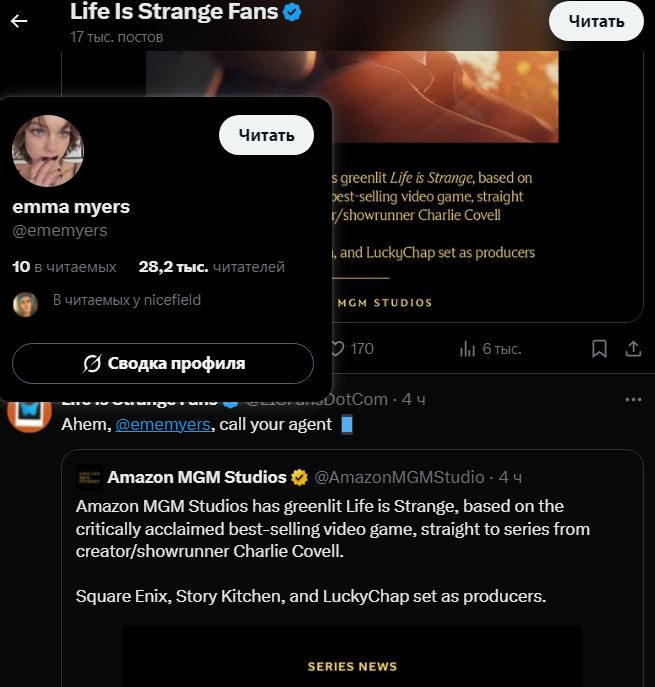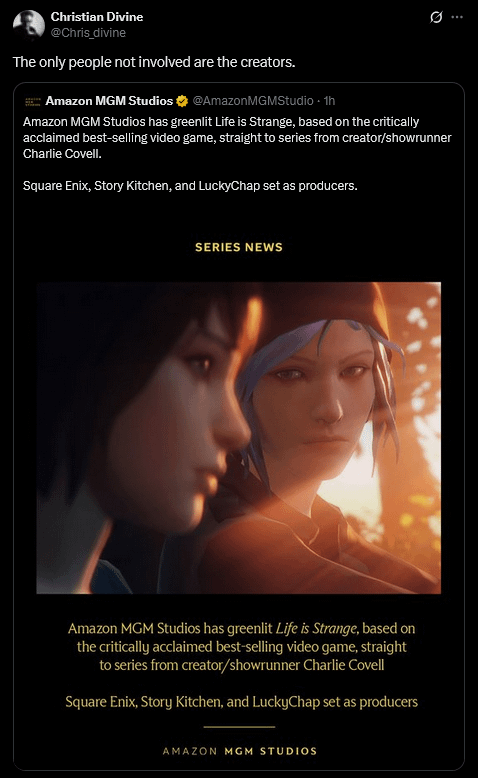 "For years we've had so many people asking us to create a Life is Strange TV show," Square Enix External Studios bosses Jon Brooke and Lee Singleton said today, "and we're so pleased to finally partner with Amazon MGM Studios who we trust will do an incredible job bringing our universe to life."