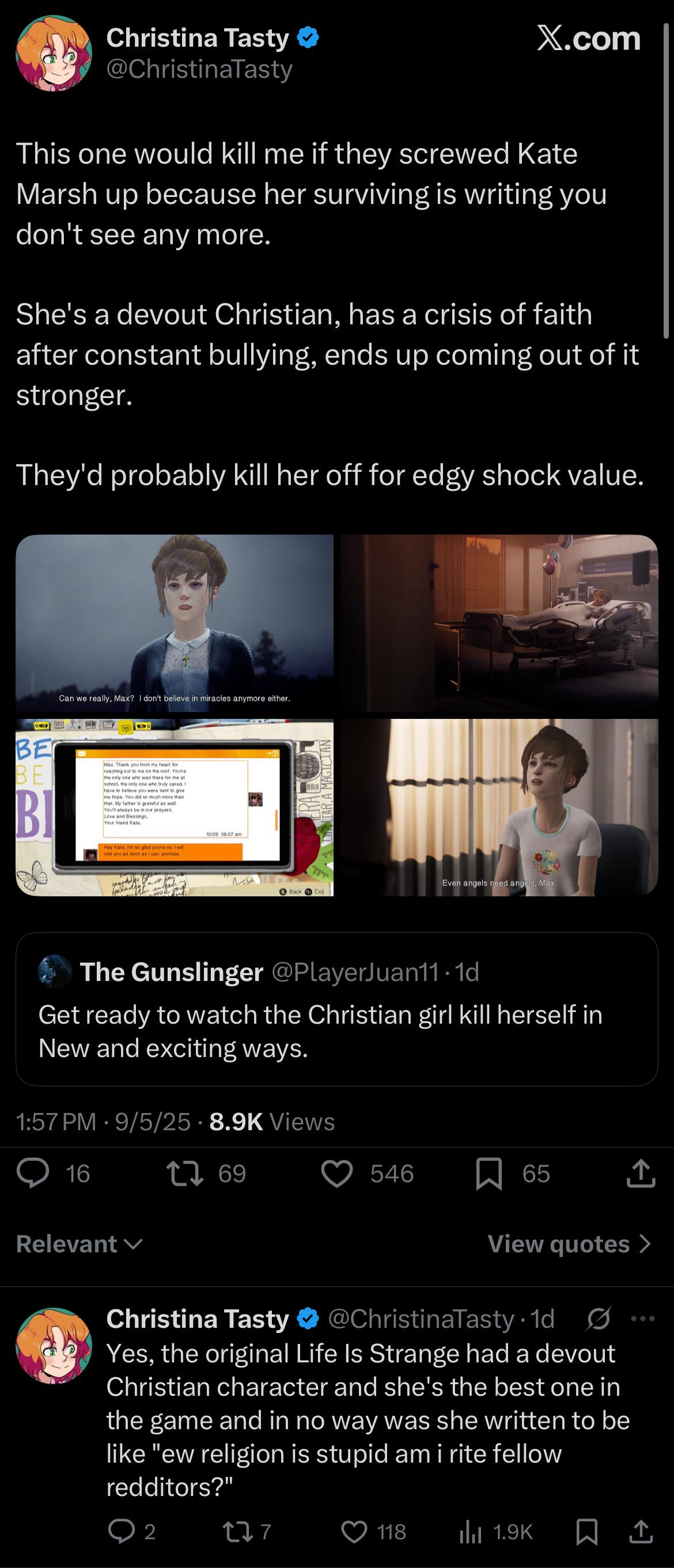 >>49580329 >Проспойлеришь себе всё подряд. Та не, и в /vg редко захожу, а на Ютубах про такое из моих протыков никто не рассказывает. Да я вообще забил на всю эту тему с Life is Strange, потому что там какие-то братья/гомики/предыстории и прочее, а тут что-то интересное.