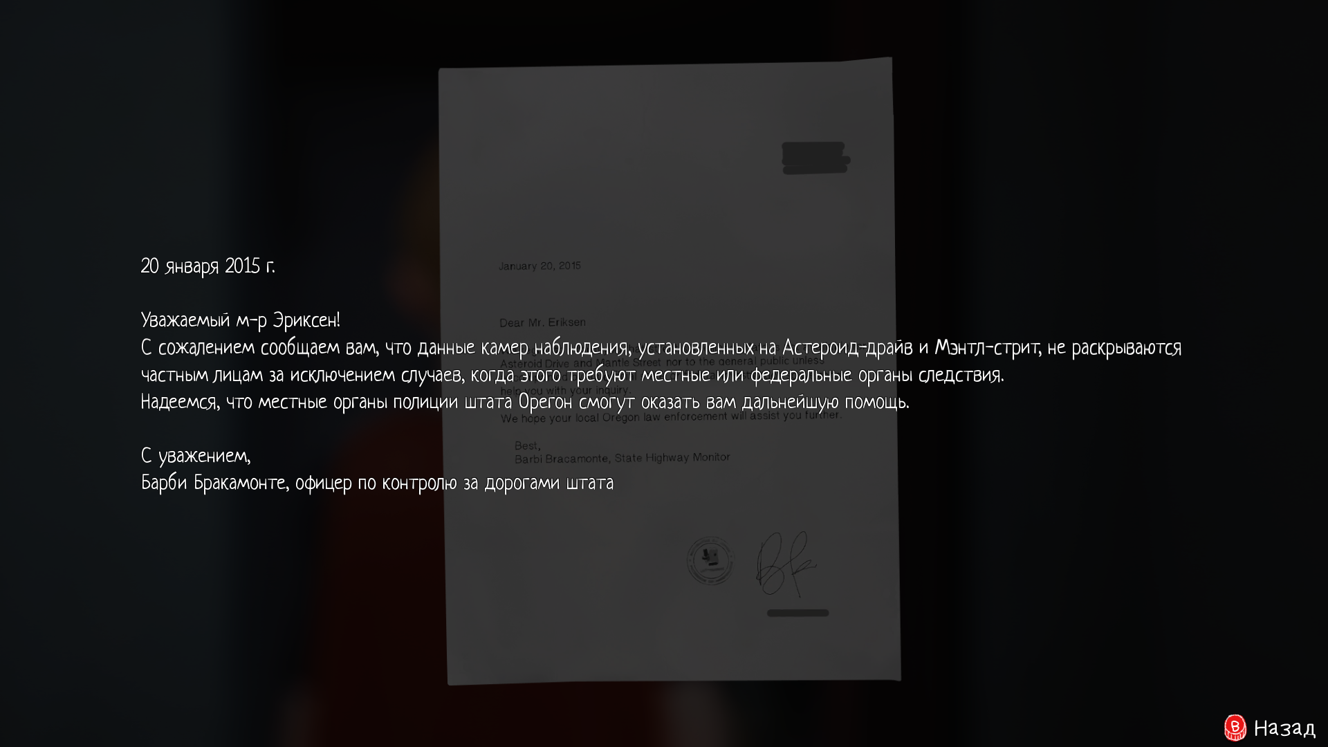 Удивительно, как сцена с Телескопом, звездой Саиф и обыском мента включила в себя почти всё, что мне понравилось в игре. Тут и повторяющиеся реакции на музыкальную игрушку и (это вообще было классно) использование этой игрушки в следующей сцене. И игра слов с Saiph - Safe, и просто красивый визуал с созвездием. И Напряженная атмосфера противостояния с копом и внезапная прокачка силы, добавляющая тебе способность перемещать предметы между реальностями. Короче, крутая сцена. Вот бы вся игра было такой.