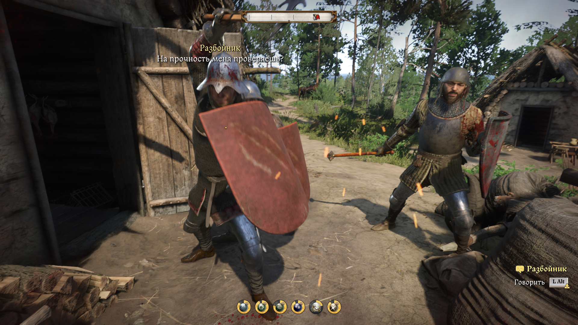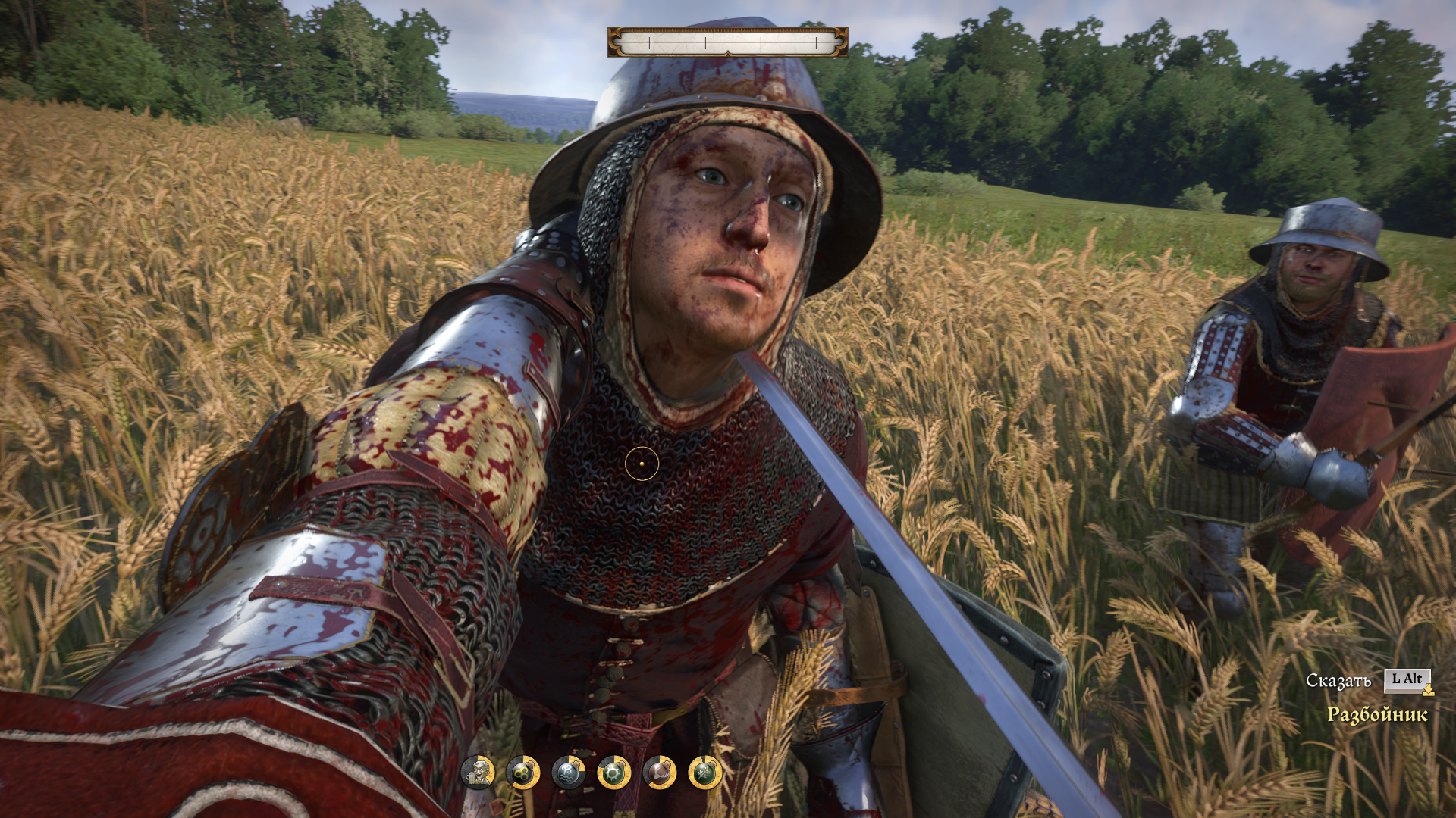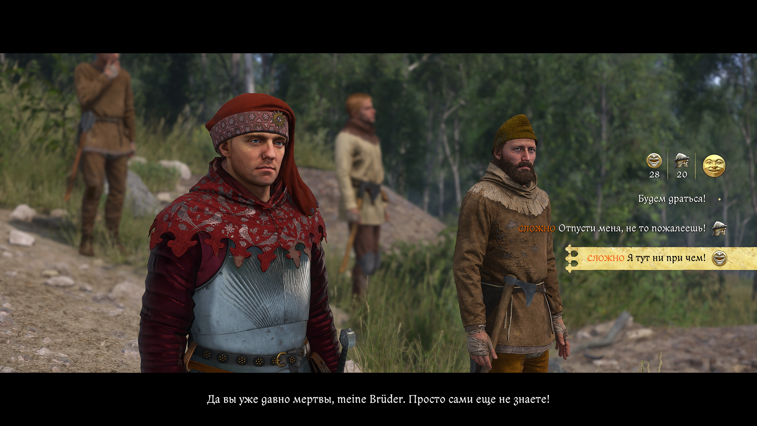 На дороге, ни с того ни с сего, до меня доёбывается агрессивный половец, и я решаю показать, что в этих лесах есть место только одному военному преступнику. Завязывается драка. В это время мимо проезжает половец номер два, а поскольку после попойки с Васко рандомные конные половцы должны помогать Жинрику, вступает в бой на моей стороне, успешно. Затем, постояв три секунды над телом половца номер один, которому он сам же и нанёс последний удар, половец номер два ловит РЕЗКИЙ прилив чувства национального единства, и кидается с саблей уже на меня! Варианта "ты еблан?" среди диалоговых опций почему-то нет.