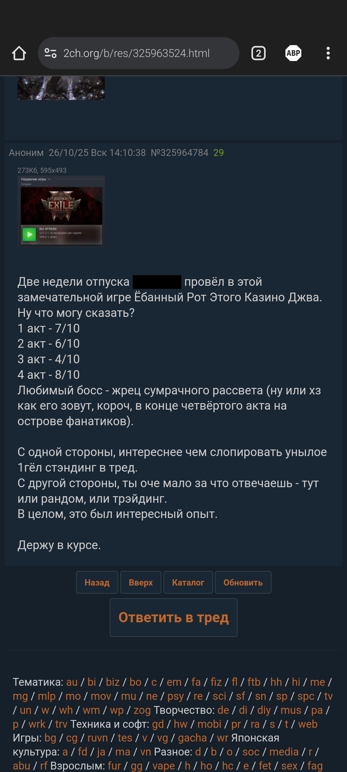 я еще 2 часа буду нормой правда сам не знаю нахуя че то нет желания запускать дырку боюсь что жопа от пое2 еще сильнее сгорит если окунусь в игру с хорошим лутом