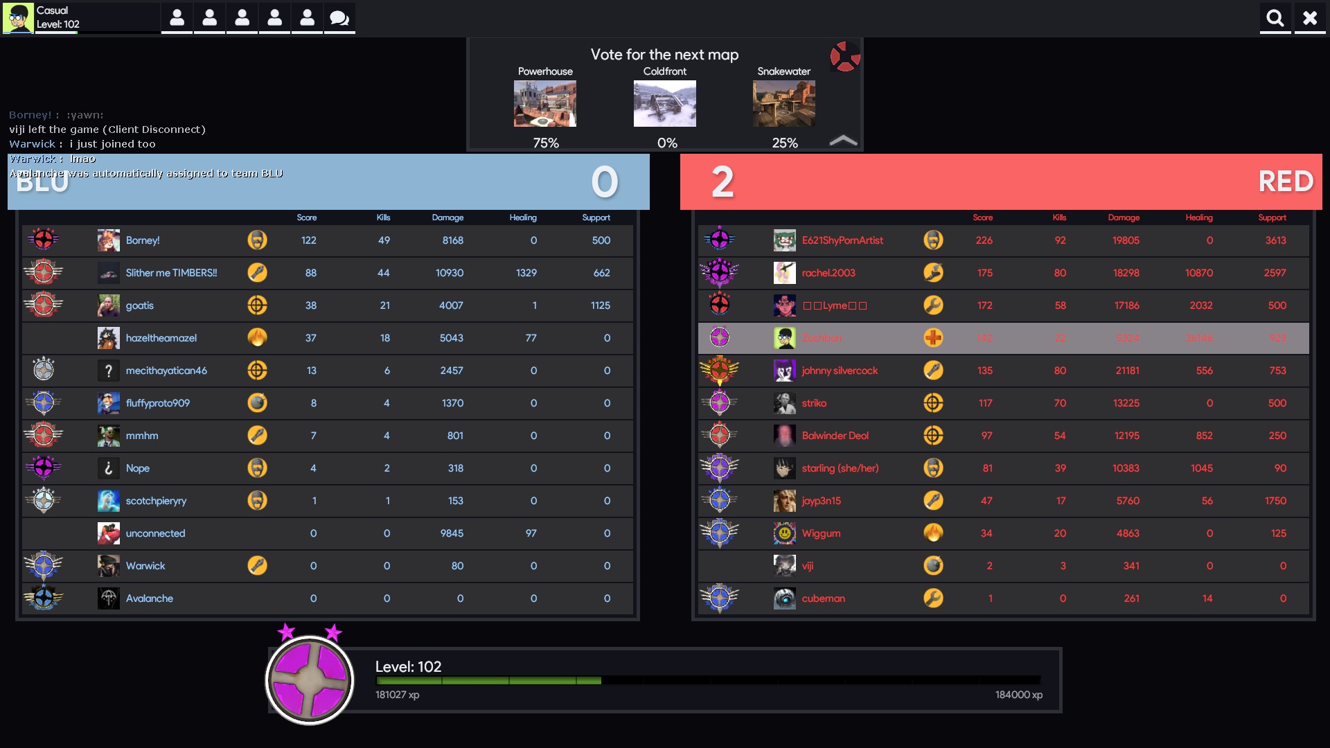 >>50330388 Играл год назад. Ну типо играют одни и те же люди. Видишь ники, знаешь у кого будет спай задрот всех вырезать, у кого солдат задрот с прямым попаданием жонглировать и ебать, у кого будет ебучий неубиваемый скаут.