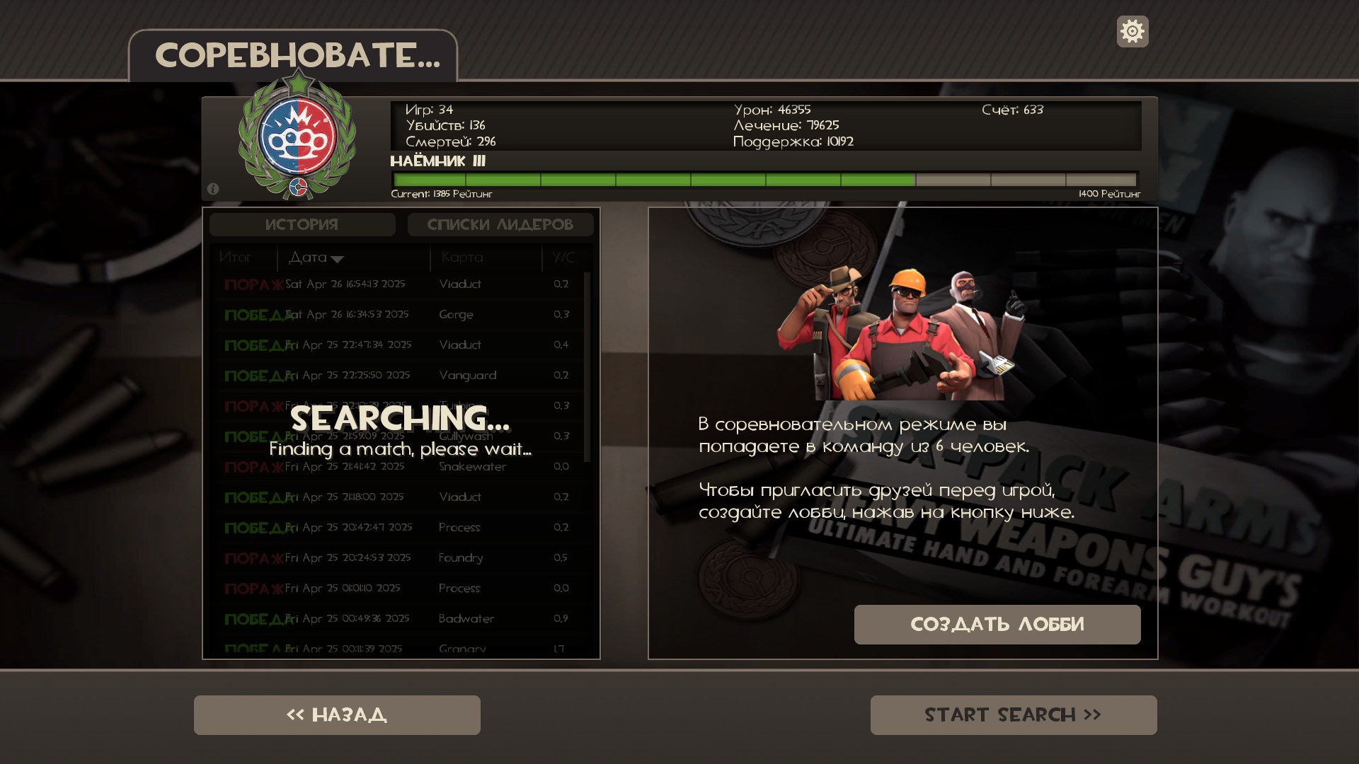 >>49963323 Либо сидишь по полчаса искать матч компететив матчмейкинге играя с одними и теми же людьми раз за разом (это серьёзно,пользователи официального компететив в деревню помещаются). В компететив играют так и тупо боги игры с 5000+ часами, либо гибусы с 50-100 часами которые недавно купили премиум и которые вообще не знают во что играют и руинят матч. Середины нет, либо бог либо новичок. Поэтому матчиейкинг превращается в лотерею.