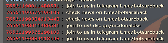>>50315121 Весь сервер накидывает репортов на бота из таба(пикрил) и тогда бота могут моментально забанить, сам был свидетелм этого несколько раз. А на читера лучше всего также в табе пожаловаться и потом зайти на его профиль стим и там же кинуть репорт т.к. это считается за разные виды репортов, или же когда тебя убили, жми на ф7 и ты можешь отправить репорт на его профиль стим прямо из игры с прикрепленным скриншотом. Только не думаю что они активно реагируют на такие жалобы.