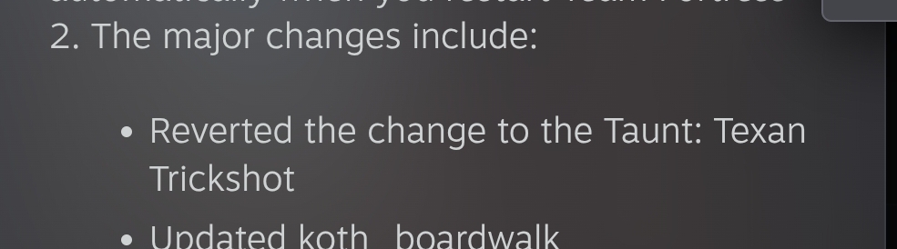 Исправлены настройки самосвечения для материалов точек захвата (исправление сообщества от Horiuchi) Исправлена ошибка, из-за которой Повелитель погоды не скрывался должным образом. Исправлена проблема с пропами и цветами команды при насмешке с помощью Мутировавшего молока. Обновлено несколько строк с исправлениями согласованности. Обновлен КонТрекер, позволяющий выполнять контракты на картах от сообщества в любом порядке. Обновлен Полуночный пыльник: добавлены стили «Без пуль» и исправлена проблема с отсутствующими треугольниками под правым отворотом. Обновлены необычные эффекты Полностью заряжен» и Перезаряжен для улучшения производительности. Обновлен Рэндольф, кровавоносый карибу, чтобы исправить отсутствующую настройку самоосвещения для команды BLU.