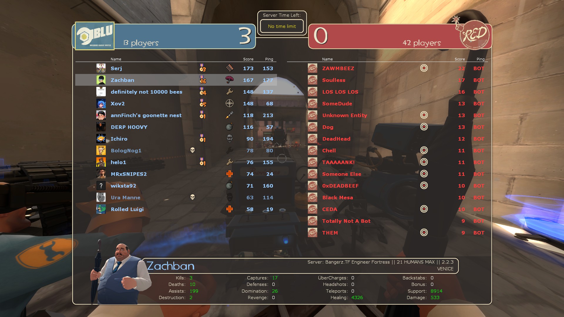 >>49939277 Этот матч идеален. Все звёзды сошлись. Тут и r34 художник по Масюне, чувак с русским никнеймом претворяющийся под англичанина и срёт тех, кто говорит на русском (вышел под конец), небинарный транс из X'a, снайпер который вчера скачал игру с ником типажа "Pablo.gonzalez.2007", фурриёза, трайхард Солдат орущий на свою команду, Троллдер и конечно-же "Engineer Gaming". А также у меня был включен "Hard Mode", если у медика накоплено больше 70% убер-заряда, то за углом мгновенно появляется вражеский Солдат или Хэви под критцкригом (абсолютно всегда, проверял на своём опыте). И да, это режим "Захват контрольных точек" поэтому игра длилась около часа с тремя ничьями. Мучался как мог.
