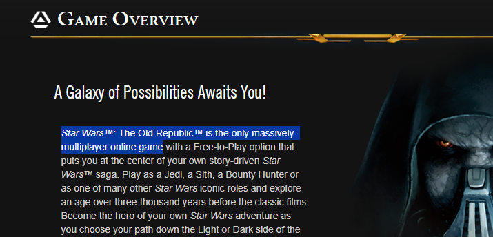 К сожалению свтор оч отвратительно ощущается в плане геймплея и общей работы игры. Моё мнение. Это даже не уровень классик вова, ну откровенно. Из-за этого мне даже понять сложно кто будет играть в эту игру как в ММО, а не просто сюжетную кампанию, завёрнутую во всратую игру.