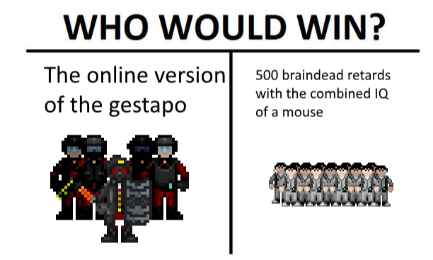 а касательно сс14 визард дены ебаные леваки которые пидорят сервера с официального хаба. До сих пор ебучие рукожопы не сделали интенты и хирургию, пока другие сервера (губ какой-нибудь и наш рузке империал спейс) заебашили и то и другое в целом у игры потенциала намного больше во всех направлениях, но кто бы там че не говорил, что у сс13, что у сс14 проблемы одни и те же: школота, фурриебы, тупые педали и мало разрабов