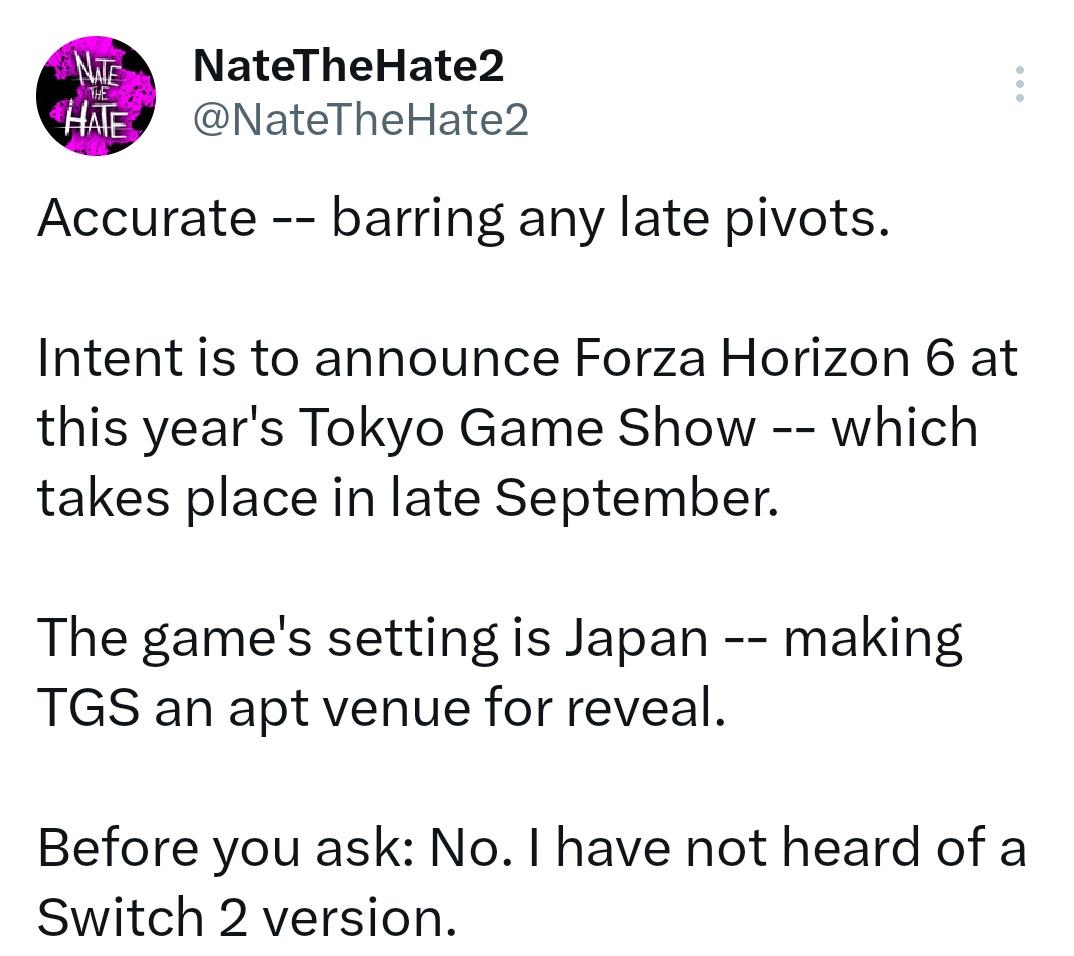 >Forza Horizon 6 планируют представить в конце сентября на Tokyo Game Show 2025 >Инсайдер NateTheHate подтвердил слухи на фоне новостей об лицензировании популярных в Японии Кей каров. Он заявил, что действие гоночной игры действительно развернётся в Японии.