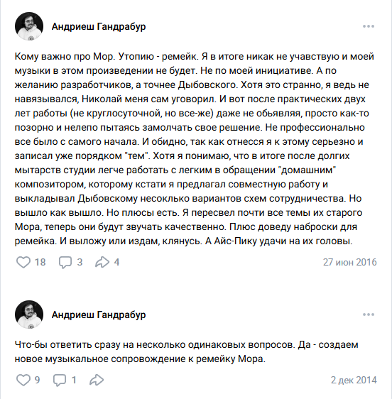 Текущие проекты IPL: • Мор-2, рут Бакалавра Вышла демка, обещают релиз в этом году (АГА) но все всё понимают и ждут в 2026-ом 2-го июля 2022 Дыбовский выкатил полотно текта о том, что рут Бакалавра будет сделан вообще на других механиках и будет гораздо проще рута Гаруспика. Без открытого мира. На начало июля 2022-го разработкой даже не начали заниматься.. • Помни (релиз 10 февраля 2022): store.steampowered.com/app/685670/Know_by_heart • Франц (вышел и забыт). • Нейросказка (разработка прекращена, вместо нее будет какая-то другая игра НемоСоды, ничего по-прежнему нет). • Консольные версии Мора-2 (патчей все еще нет и, видимо, не будет никогда).