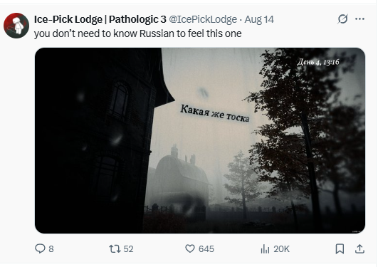 >>50251348 Глянул трейлер - круто-то круто, но ведь мы понимаем, что на релизе всё засрут фирменными для ироничного ру-геймдева смехуёчками столетней давности уровня ПИВОЗАВРА, Волк ловит яйца, лобовыми отсылками к Стругацким про НЕОНКУ и далее по списку. Мне кажется, у Дыбовского есть, как минимум, одно достоинство. От его писанины не воняет ироничными текстами программистов нулевых, как литералли от всего ру-геймдева. Недавно вот глянул, как там Militsioner поживает. Пожалел. Удалил из вишлиста.
