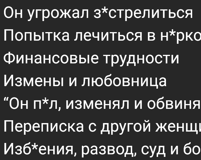 Ну хуй знает, ни одна рспэха не признает, что выходила замуж по велению пизды, а не думая головой. У всех истории как под копирку: "выходила за нормального мужика, а он превратился в монстра, который однажды перешел черту". Но блять они в загс не с котом в мешке шли, а с вполне конкретным человеком. Как по мне ей как раз хотелось всей этой движухи, чтоб как в сериалах - красивые ухаживания от статного и знаменитого мужчины, который выбрал из десятка телок именно ее, страсть, свадьба вопреки предкам, рождение ребенка, скандалы, слезы, потом переход красной линии, в ее случаи ББПЕ, и громкий развод, чтоб потом мемуары написать, наверное, кек. Ни одна рспха не скажет, да я сама тупая дырка виновата, что башкой не рубила за кого выхожу. Типичное бабское лицемерие.