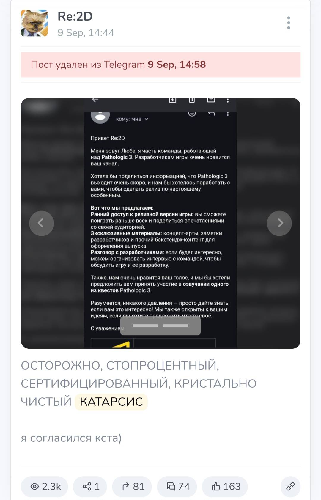 Во-вторых, вышло ультмативное интервью с Ренатой, и там, ВНИМАНИЕ, НАБРАЛИ ВОЗДУХА? Помимо Ренаты приложены рассказы той самой Систер Оле с платинового скриншота!!! Она заговорила! И накидала приколов пока в отношениях с ним была. Кроме того там есть записи Ренаты с бухим маэстро и прочий треш. Комментарии к видосу отдельный жанр. И там в целом очень много контента, в том числе о какой-то студентке с потока Ренаты, которую наш геймдизайнер якобы ебал, пока Рената была беременна, потом эта студентка чуть ли не в дурку попала, а потом он пристроил ее работать. В общем, рекомендую к просмотру!