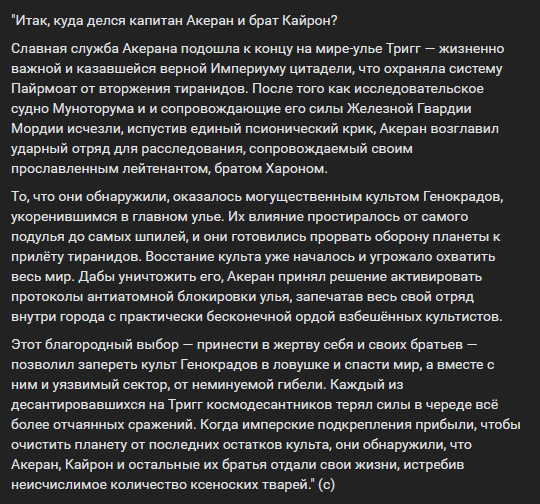 Че как вам новая операция? Отдает прям вторым Чужим, бегаешь по корридорам, хуяришь тиранидосов. Я не совсем еще понял какие есть варианты развилок, поиск глаз сервиторов видел, видел какие-то штуки надо нажимать перед лифтом, я хуй понял правда, где эти символы нужно смотреть, но разберусь. Босс там такой себе, не скажу, что пиздатый, но уже уникальный и заебись. А вот то, что после босса надо съебывать со всех ног на точку эвакуации - это вот особенно охуенно, этого не хватало в прошлых операциях.