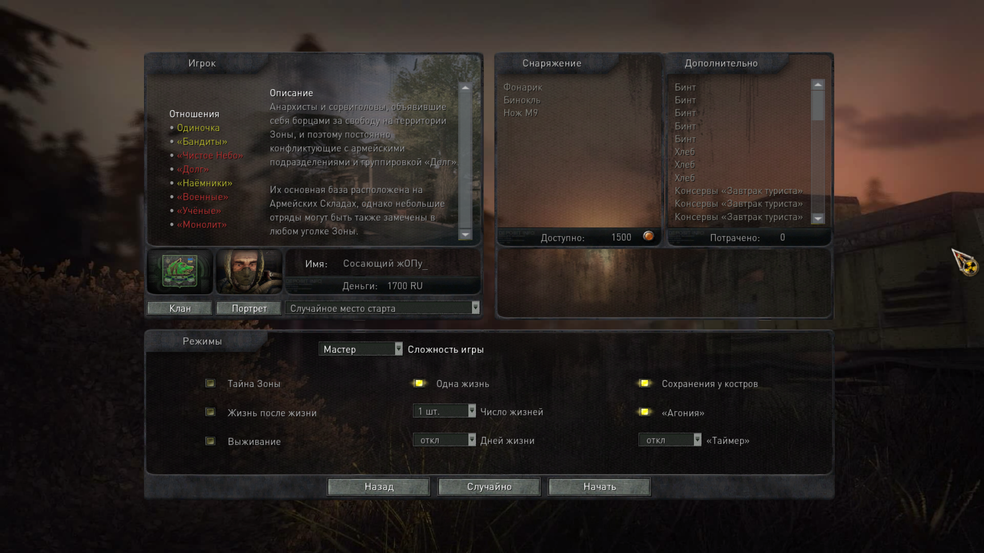 >>50066052 Скорее поверю в то что большая часть "населения" Зоны, это все таки здоровые мужики и\или с отборным обменом веществ. Короче говоря любой кто в Зоне, кроме торговцев\гомолита\некоторых членов других группировок - они в Зоне не долго. Т.е. каждый раз делая вылазку они полагаются на свой организм и его ресурсы. Поэтому думаю что реалистично что условный вытиран-одиночка (наебал - мастер-одиночка ибо первых нету) решивший сходить за жирными артами в какие-то ебеня с пусть уловного Бара будет таскать с собой: -собсна сам костюм - пусть не экзач а условная сева без шлема и\или без системы фильтрации воздуха ну или заря. -ствол и пусть 3-6 рожка\2 пачки дроби если это дробовик -пара-тройка литров -хавчик типа две консервы\дилдоколбасы\батон и еще 1кг чего-то -ну пусть 1кг таблеток -мешок если ебеня в ебенях -ведро для артефактов И все? Все.