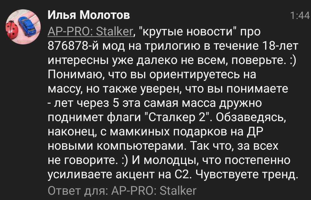 Как я понял, Сталкер 2 вообще не приняли и закидали говном. Моды всё исправят, но видимо это произойдёт ещё нескоро. Если вообще произойдёт. Мне одному в глаза рябит эта палитра в С2, когда трава/деревья/заборы в единую непроглядную хуйню сливается?..